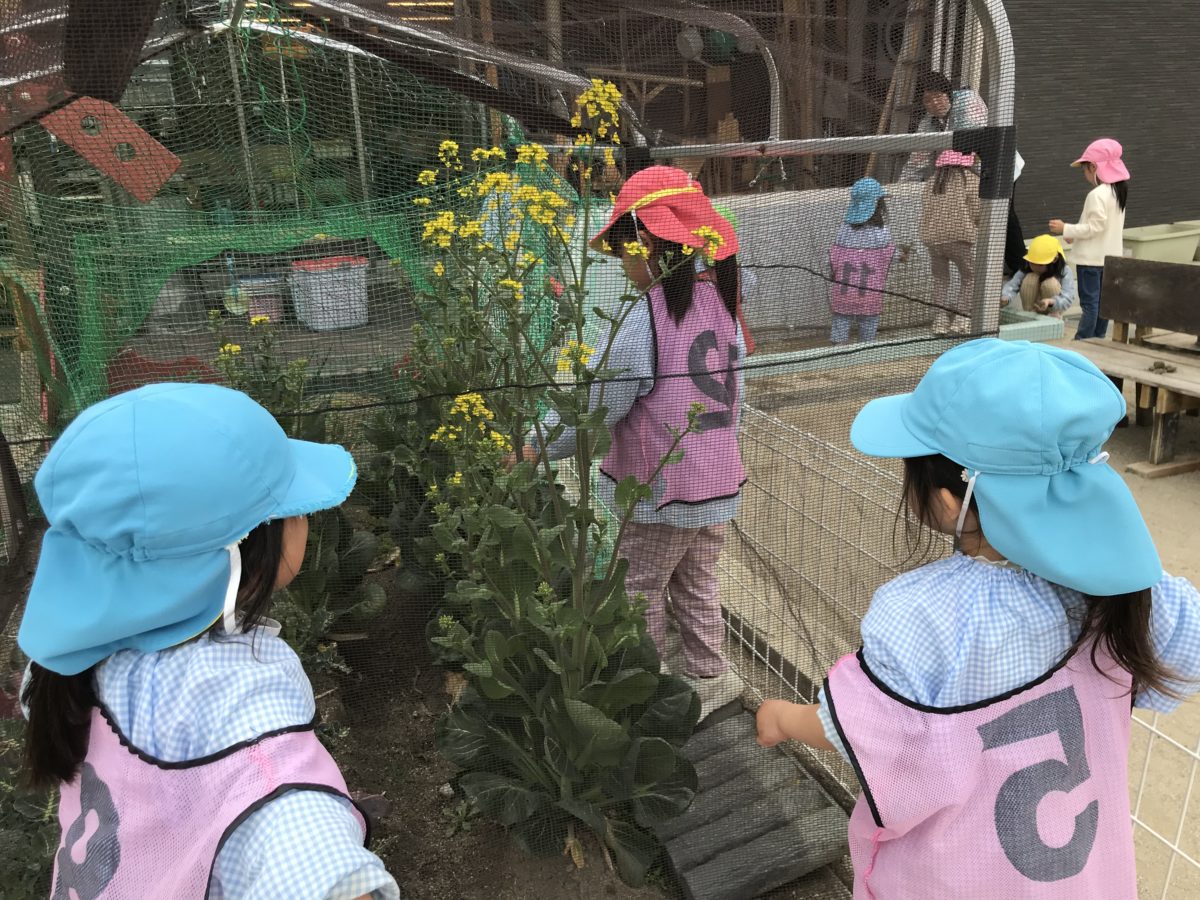 畑にある小松菜の花がお休みの間大きくなっていることに気づいた子どもたち。「あれ?こんなにおはなあったっけ!?」「おおきくなってる!」「なんこになっとるかかぞえよ!」「1・2・3・・」「ぜんぶで42こやった!」とお花を数えている姿がありました。その姿を見ていたりんご組のお友だちも「なにしてるの!」「きいろのおはないっぱい!」と興味津々な様子でした。園庭では、めろん組のお友だち対ばなな・さくらんぼ・りんご組の友達でリレー対決することに!「めろんぐみはひとり2しゅうにしよ!」「にんずうどうする?」「めろんぐみが2しゅうだから8にんで・・・?」「16にんぶん?!」「ばななぐみさんたち16にんあつめてー!」と走る数が同じになるよう自分たちで計算しながらチーム決めをする姿がありました。よーいどん!とスタートしおばなな組のお友だちは「つぎだよー!」とりんご組のお友だちのサポートをしたり、めろん組のお友だちは走る順番を工夫したりとお互い勝ちたい!という気持ちで全速力で走っていました。めろん組のお友だちの速さにはかなわず、負けてしまいましたが「もっかいやりたい!」と悔しさを感じながらも挑戦する素敵な姿がありました。
