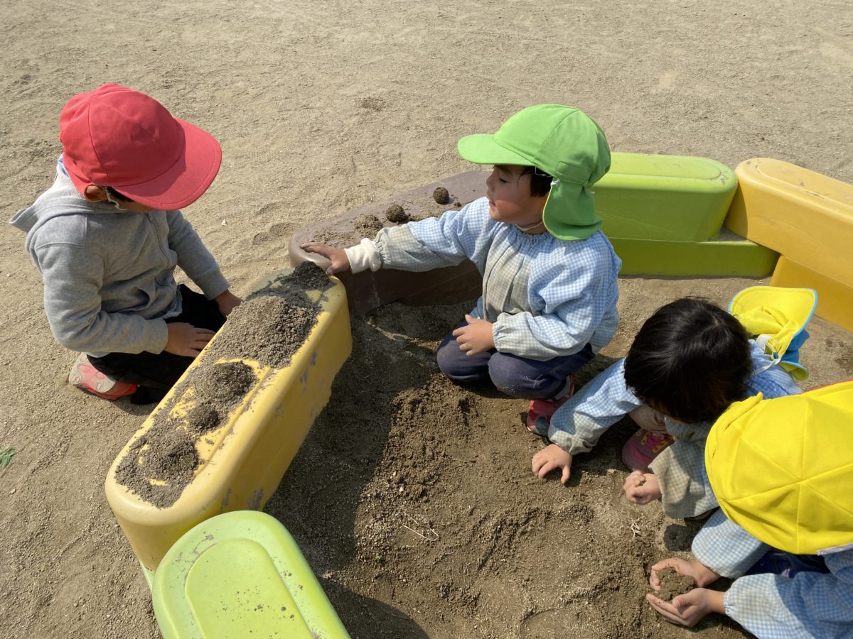 昨日に引き続きあたたかい日差しの下で畑の小松菜やブロッコリーがすくすく成長している姿が見られました。花の数も増えてどんどん背丈が高くなる小松菜のお花を摘んだり、カットしました。たくさんのお花を束ねて「は・な・た・ば、できるかな!?」と挑戦したり、うらやましそうにじっとお花を見つめるりんご組さんのお友だちにお花をプレゼントする姿も見られました。お花を触っているうちに黄色い粉が手につくことを発見するとそれが「花粉」であることに気付き、これが花粉!!花粉症!?と自分の知っているキーワードを並べてお友だちとユニークに話していました。揺らすとどんどん出てくる花粉の量に驚いたり、香りが思っていた以上に強いことにも気付いて話す様子もありました。たくさんの素敵な花束が出来るにつれてだんだんお花の元気がなくなりお辞儀しているようになっていることにも気付いて、水分を与えてみたり工夫する姿がありました。お花と共に素敵な笑顔が見られていました。午後からのおにレンチャンリレーでは、勝負にこだわりてきぱきと順番を回すかっこいい姿がありました。