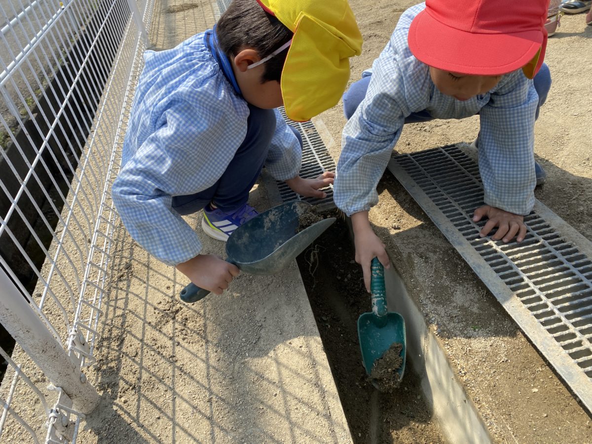 溝にたまった砂の片づけのお手伝いをしてくれました。できるだけたくさんすくおうと頑張っていました。