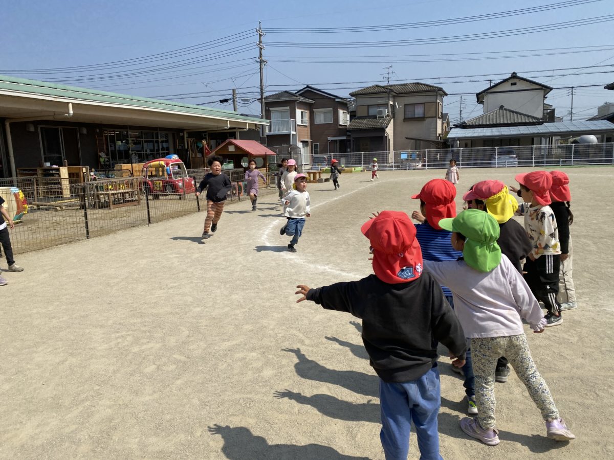 もう今年度最後になってしまうかもしれないおにレンチャンリレー。緊張の真剣勝負!の一走者のお友だちから二走者のお友だちにバトンタッチ!の瞬間です。