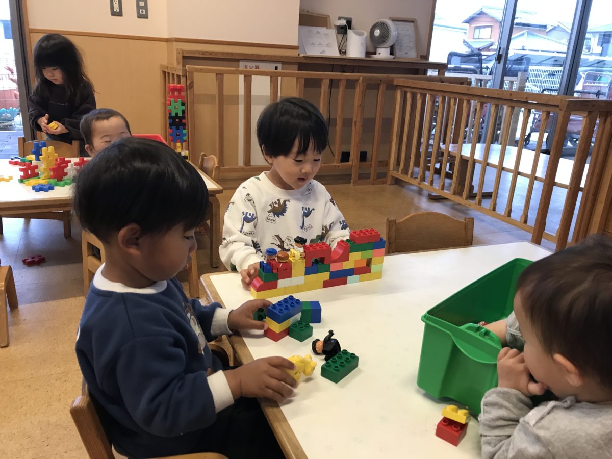 ブロックで遊んでいたお友だちは、「新幹線作るの!」「どれどれ~?」と思い思いの形を作ってみたり、お姉さんと一緒になって高くブロックを積み上げて、手の届かないところは「やってあげるね!」とお姉さんの力を借りて高く積み上げることが出来ると、「できた~!」と一緒になって喜んでいました。