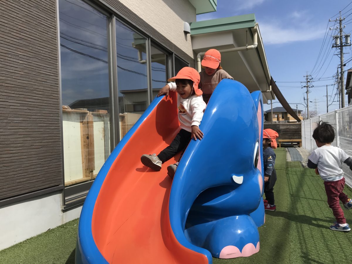 園庭にある側溝のふたに乗って足踏みをすると、「カンカンカンカン」と音が鳴ったのに気がつき、何度も繰り返し足踏みをして音が鳴るのを楽しんでいました。隣にあったぞうさんの滑り台を滑っていたお友だちは、「じゅんばん!」「いっていい?」と会話をしている姿が。滑り終わるとる次の子に「いいよー!」と言っている子や下から登ろうとしている子に「かいだん!」と自分たちで教え合っている姿もあり、少しずつ遊具でのルールを学んでいるようです。
