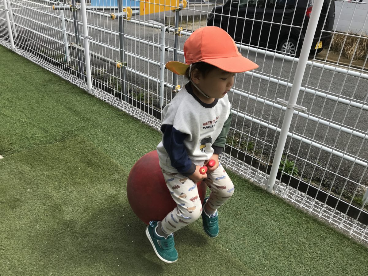 バランスボールで遊んでいたお友だちは、ピョンピョンと上手に飛び跳ねながら、どこまで行けるかな?と園庭の端から端を行ったり来たりしていました。外に止まっていたクレーン車を発見すると、「あー!クレーン車!」とお友だちにも伝えている姿があり、着ていた服にクレーン車が描いているのを見つけると、「みて~いっしょ!」と同じことを喜んでいました。