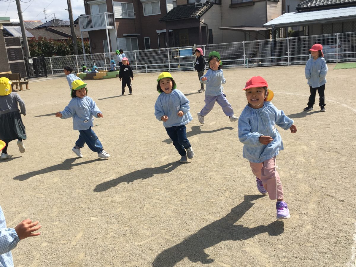 お部屋では様々な童謡が流れてくると「このうたしってる!」と歌い始めた子がいるとどんどん集まり出し、「てーをーたーたーきーまーしょう♪」と元気な声が!そして歌に合わせて手を叩いたり、足踏みしたりする様子のある子どもたち。「なぁなぁきょうでばななぐみさいごやな。」「あしたからはさくらんぼしゃんになるの!」と1つ大きくなることを楽しみにしている子どもたちの声もたくさん聞こえてきました。そして…「めろんぐみさんはほいくえんにくるのきょうがさいごなんやんな。」と少し寂し気な声がするとめろん組さんも「いっぱいいっしょにあそぼうな。」とみんなに話しかけていました。園庭に出ると「りれーもしたいし、おにごっこもしたい!」とやりたいことが盛りだくさん。リレーも真剣勝負で戦い、鬼ごっこも2種類楽しみました。「こおりおにのおにさんってなんかエルサみたいじゃない?だってさわったらこおるんでしょ?」「じゃぁおにさんはエルサ!」となり「わたしやりたい!」と鬼もいつもより多めの鬼ごっこがスタート!みんな鬼から必死に逃げていました。そして今日のチャンピオンは…めろんぐみさん!「やったーさいごのひにも1いになれたわ!」と嬉しそうに話していました。