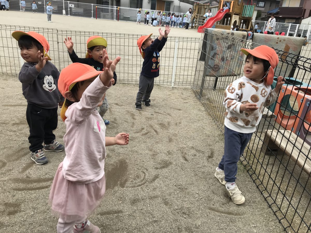「ヘリコプターバイバーイ!」ヘリコプターを見つけてお友だちと手を振っていました。