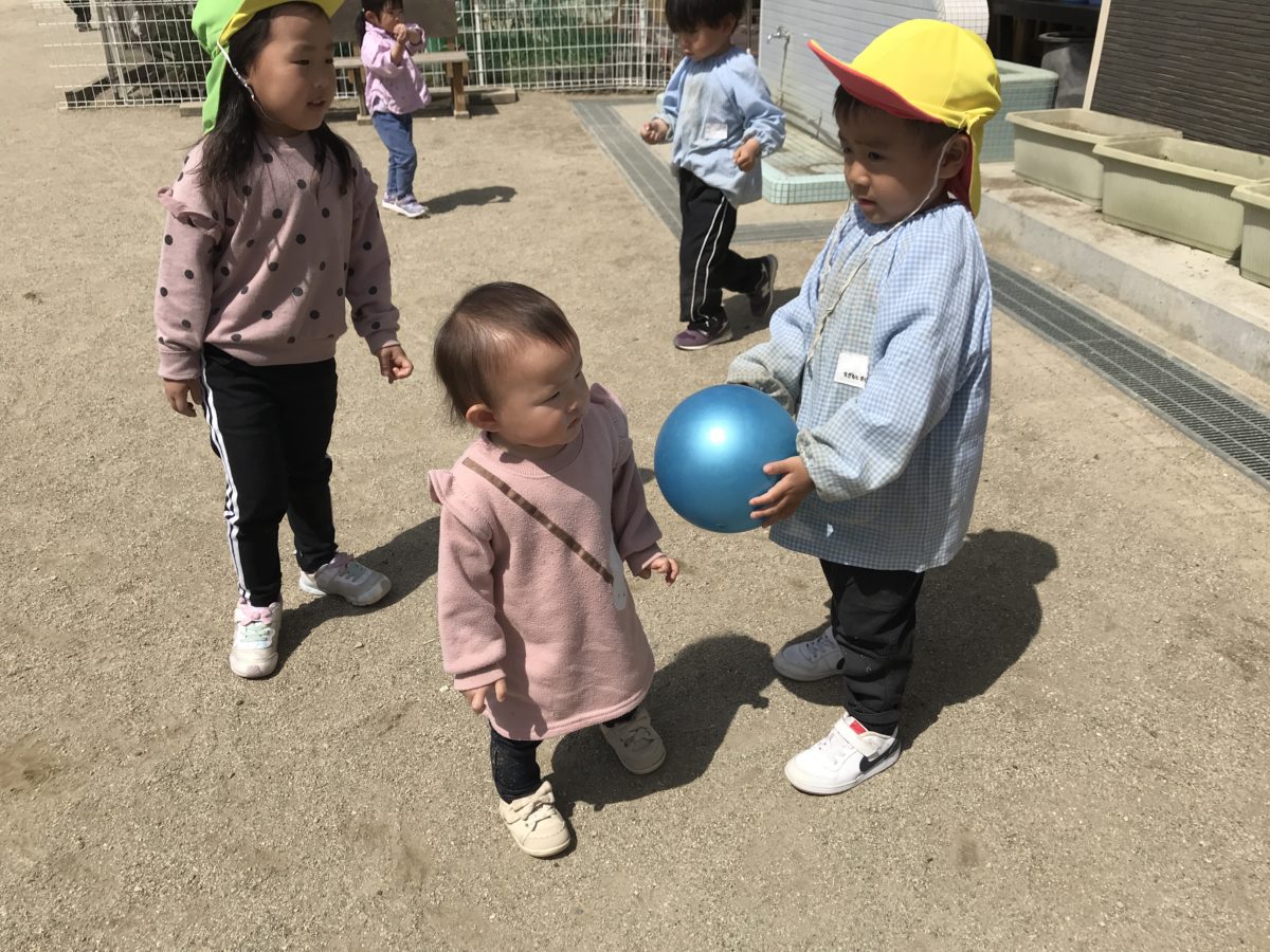 「使う?」ボールをいちご組さんに渡しています。