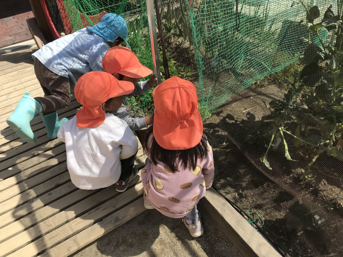 「はっぱ~!」「これな~に?」畑に植えてある野菜をじっと見ていました。