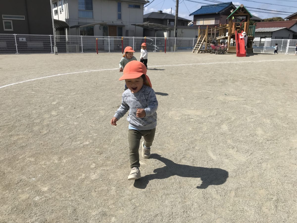 広い園庭に出ると、畑に植えてある野菜をじっと見ていたお友だち。「はっぱー!」「おはな!」と何が植えてあるのだろうとずっと見ている姿がありました。砂場に行こうとしていると遊具が目に留まり一目散に走っていくお友だち。「よーいどん!」と声を掛けるとくるりと向きを変えて砂場の方に向かっていきました。砂場に着くと、お兄さんお姉さんの真似をして団子を作ろうとしている子や、穴を掘ろうとしている子が…。自分の手がすっぽり入る程の深さになると満足げに笑っていました。