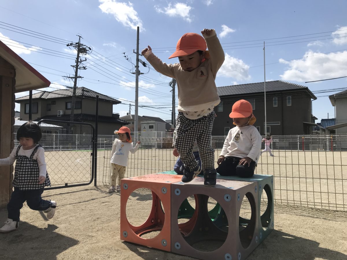 園庭に出て遊んでいたお友だち。カラーボックスの上にみんなで座ると「バスだよー!」と話している姿があったので[バスごっこ]の歌を流してみました。すると、歌詞に合わせて身体を左右に倒して「きゃー!」と声を上げて楽しんでいました。その後カラーボックスからみんなが降りるともう一度上に乗ったお友だちが「ジャンプ!」と飛び降りるのを繰り返していました。