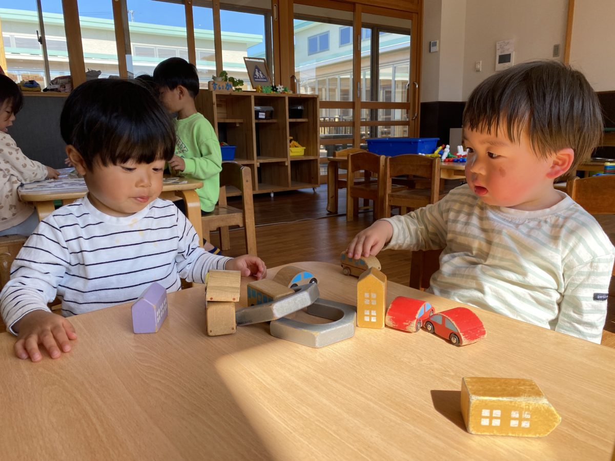 ブロックを長くつなげたり、乗り物のおもちゃを走らせたりと好きなおもちゃを手に取り楽しそうに遊ぶ子どもたち。中でも夢中になって遊んでいたのが乗り物のおもちゃ。バスや車のおもちゃを一列に並べ机の上を「ぶーん」と走らせたり、車を積み上げてみたり。そんな中こっそり別の場所で大きな紙に線路を描いてみると・・・早速気がついた子どもたち。「なにこれせんろ?」と不思議そうに段々と出来上がっていく線路を見ています。書き終えると「せんろ!」「ま!ま!(くるま)」と言いながら嬉しそうに線路の上を走らせて楽しんでました。