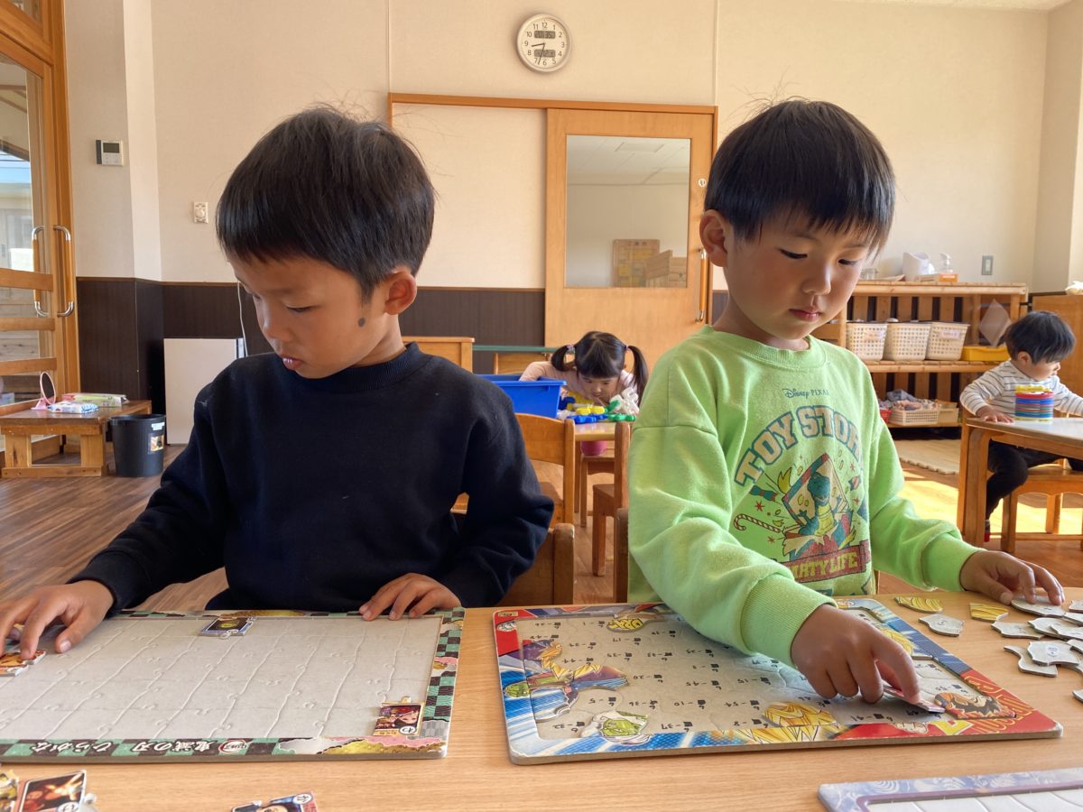 別の場所では大きいお友だちが折り紙に夢中な様子です。「ぼくかみひこうきつくる!」「わたしもつくる!」と気がつけば机の上は色々な形をした紙飛行機でいっぱい!それぞれの飛行機を手に取ると「どれがいちばんとぶかしょうぶだ!」と順番に飛行機を飛ばしながらお友だちと競争です!「すっごくとんだ!」と遠くまで一直線に飛ぶ紙飛行機もあれば「うわぁ~!もどってきた!」とくるっと元の場所に戻ってきてしまう紙飛行機。形によって違う飛び方をする紙飛行機に「もういっかい!」「へんなとびかた!」と大盛り上がり!「ちがうかたちもつくる!」と何度も試行錯誤しながら小さな紙飛行機博士が誕生していました。「うーんもういっかい!」と紙飛行機作りの研究はまだまだ続きそうです。