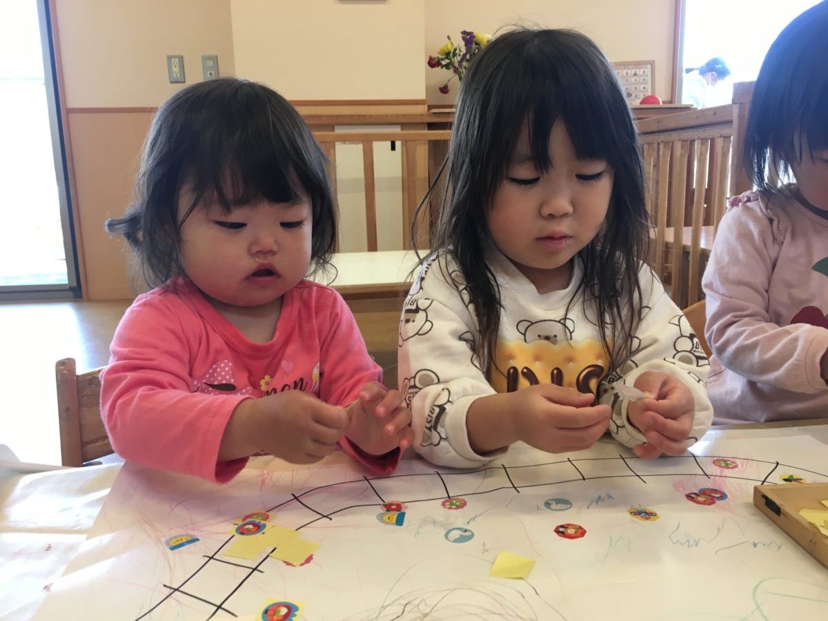 りんご組のお姉さんを見ながらシール貼りに挑戦