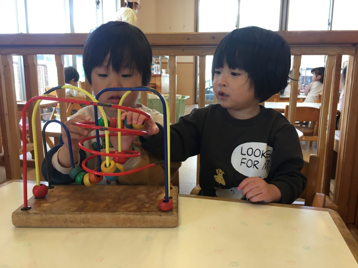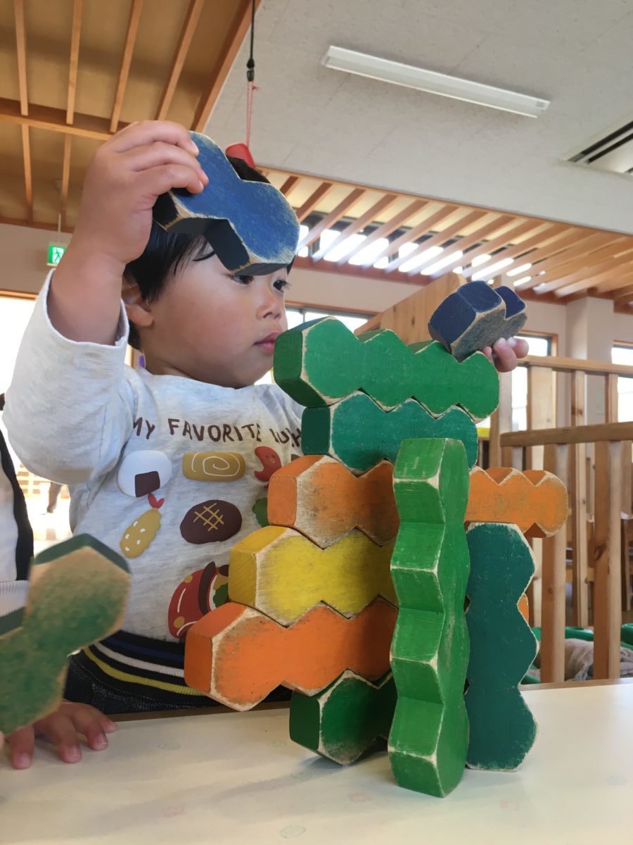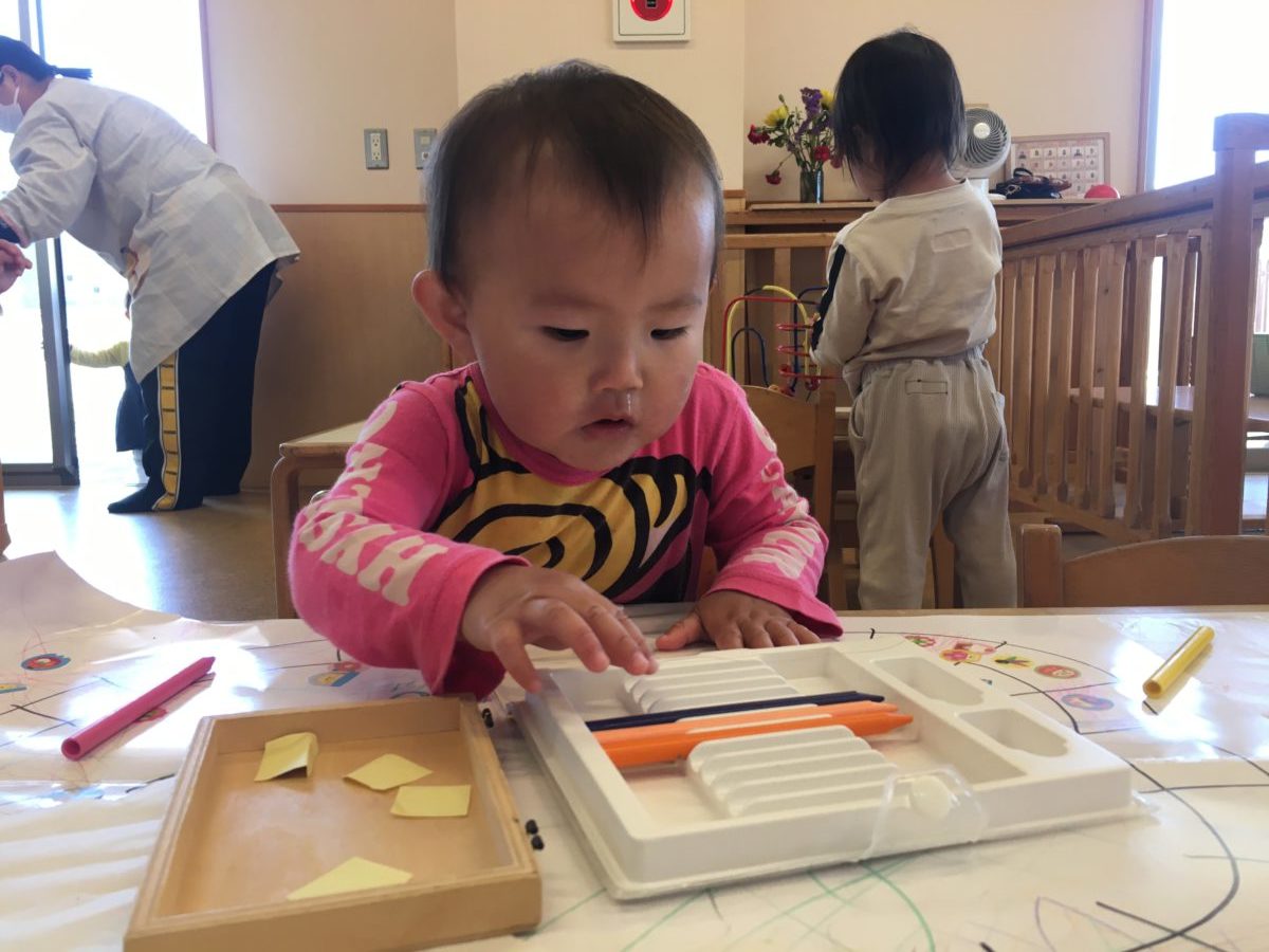 保育室の机には様々なおもちゃでいっぱい!子どもたちは好きなおもちゃのところへいくと椅子に座りおもちゃを手に取り楽しそうに遊んでいます。中でも人気だったのが不思議な形をしたカラフルな積み木。これなんだろう・・・?と積み木を真剣に見つめたり高く積み上げてみたり。横に寝かせて積み上げる子もいれば、縦にして手が届かなくなるくらいまで積み上げるお友だちも!色々な積み方をしながら遊んでいる中「これあか!」「これきいろ!」と何やら色に興味を示し始めた様子。「どんないろーがすき?」と楽しそうな歌声も聞こえてきます。そんな様子から、”どんないろがすき”の音楽や色に関するアイテムを準備してみる事にしました。好きな色のクレヨンを手に取ると紙の上でぐるぐる。片手に数本持って色をのせるお友だちや、中には両手にクレヨンを持ちぐるぐると描くお友だち。様々な持ち方をしながら、何度も同じところを重ね塗りしながら色遊びを楽しんでいました。