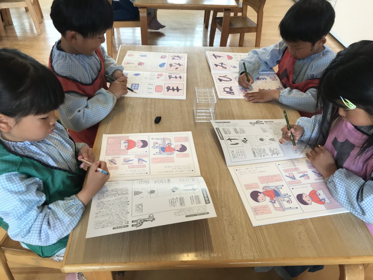 室内では、めろん組のお友だちがひらがなのワークに挑戦!はじめのページをみてみると鉛筆の持ち方が書かれていることに気付いた子ども達。「こうやってもつの?」「こうじゃないー?」と相談し見比べながら鉛筆を持つ姿がありひとつひとつ集中して丁寧に書いていました。