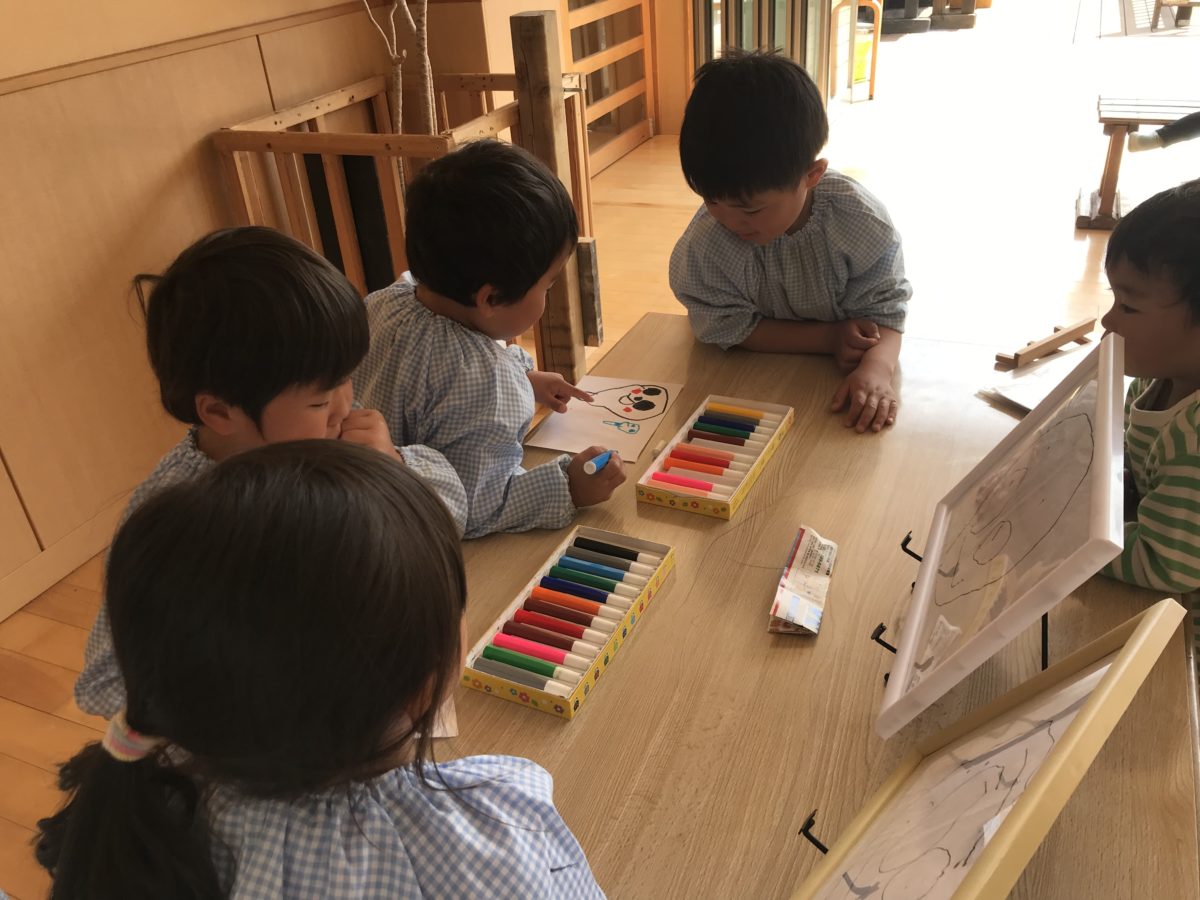 「みてここはくちで、でっかいめもかいた!」とばなな組のお友だちも似顔絵に挑戦!
