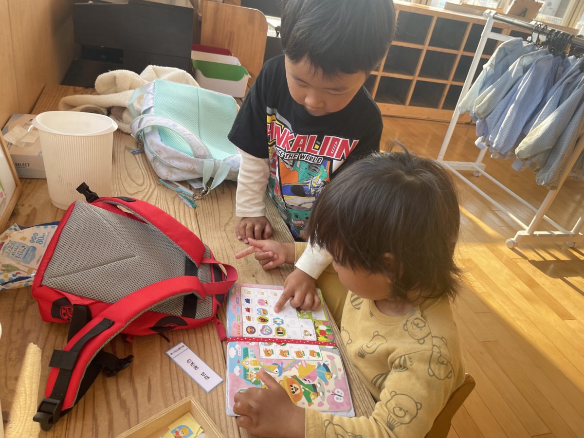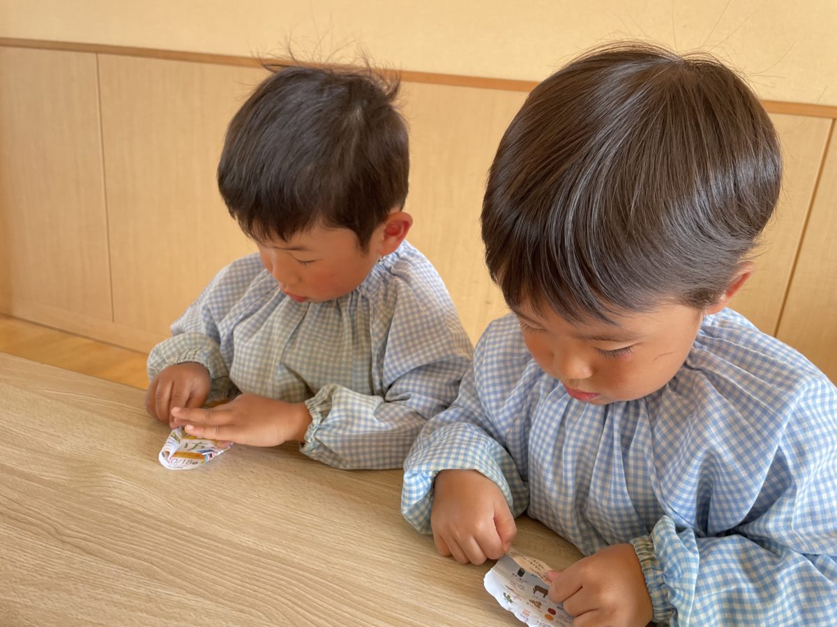 朝、お便り帳にシールを貼ろうとしていたさくらんぼ組さん。「きょうどこだろう?わかんない・・・」とつぶやいたのを聞いて「おしえたろっか?」とばなな組のお兄さんが「きょうはここ!1と7のところだよ」と指でも貼る場所を教え「ここね。わかったー」とその後、上手にシールを貼ることが出来たさくらんぼ組さんでした。園庭では、畑の柵を少し動かしてみると「だんごむしおったー」と小さいダンゴムシを見つけると「こっちにもおるんちゃう?」と次の柵も少し動かしてみると…「2ひきおったー!」とさっきよりも少し大きめのダンゴムシを2匹見つけた子どもたち。「ここのけーすにいれよ」と小さめのケースに入れながらしばらくダンゴムシを観察していました。「だんごむしってはっぱたべるかな?」と畑からブロッコリーの葉っぱを見つけケースの中へ…「だんごむしさんたべてくれるとうれしいな!」と見守っていると「だんごむしはっぱへ、よってたー!たべるかな?たべるかな?」とさらにダンゴムシの観察を続けていました。「元気なくなるとあかんで、そろそろにがしてあげよう!」とたっぷり観察したあとには優しく畑へ戻す子どもたちでした。