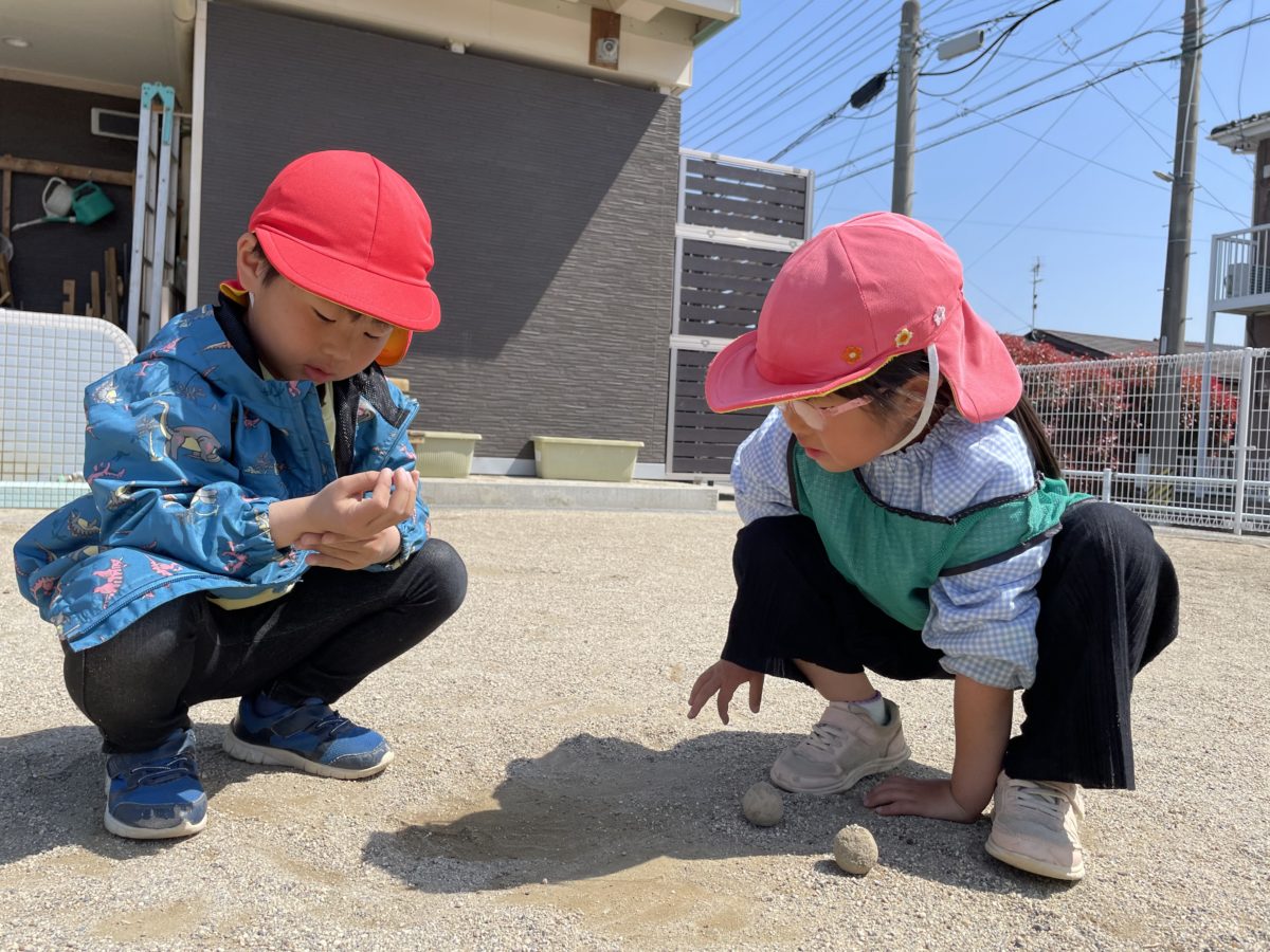 どろだんごこうやって作るとピカピカになるよ♪と新しいお友だちに教えていました。