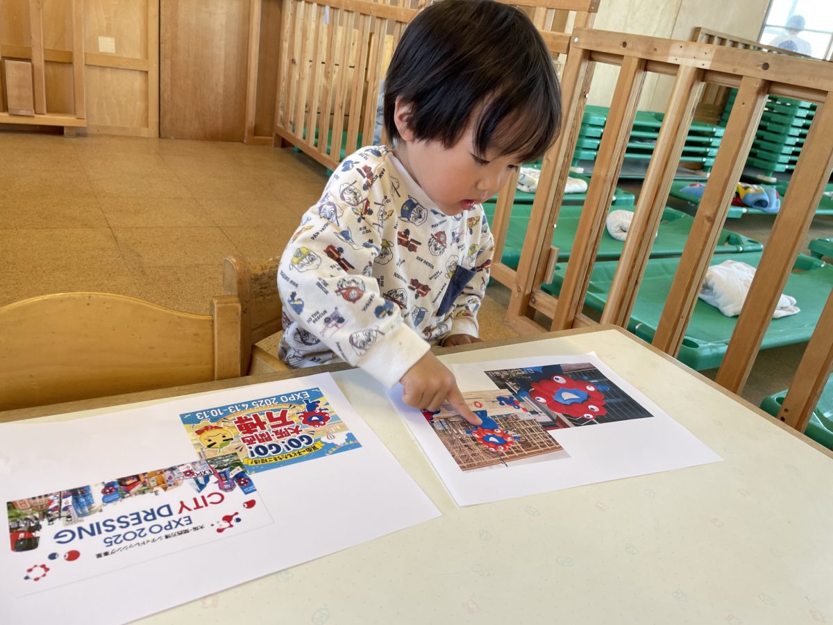 今日も園庭に出ると、「見てみて!」とお友だちに話す声が聞こえたので、なんだろうな〜?と見ていると、園庭地面で絵を描いている子ども達。「見てみてきのこ!」と丸描いて下に棒を引っぱって描いたキノコ。自信満々に見せているお友だちはとても嬉しそうでした。お部屋でもお絵描きが出来るように紙とクレヨンを用意すると、嬉しいそうに「あおぐるぐる~!」「赤あるね~!」とクレヨンを出してみては色々な丸を描いて楽しんでいました。赤い丸を描きながら、「ミャクミャクいたね!パパとママとピースしたの!」とお休みにあった出来事を話し出すお友だち。「昨日はコアラちゃんのぬいぐるみが家きたの!」「スーパー行ったね~。」とそれぞれに休日の話をしていたので、最初に話していた万博のキャラクター“ミャクミャク”と“コアラ”の資料を用意してみると大喜びで「これー!ミャクミャク!」「ミャクミャク?」「赤のね~これがね~ミャクミャク!ピースしたの!」と嬉しそうにお友だちに見せて話していていたりして、お休みにあった出来事をこんなにも鮮明に話が出来るんだなと感心しました。これからもっと色々な話をお友だち同士でするのかなっと思うと、楽しみですね。