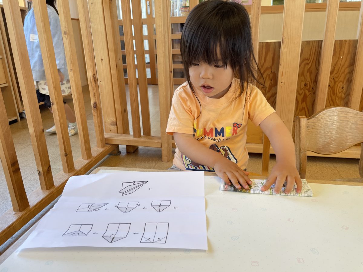 他にも最近折り紙にも興味のある子ども達。先日折り紙で作った紙飛行機が園庭に落ちているのを発見!その飛行機をみんなで持って観察。「これなに?」お姉さん、お兄さんがいるお友だちが知っていたのか「ひこうき!」と嬉しそうに話している姿があったので、折り紙をも用意し、一応紙飛行機の折り方が分かる紙も用意すると折り方の紙をじーっと見ながら何とか作ってみようとする姿があり、紙飛行機を何とか作ってみようとする姿がありました。一緒に作った紙飛行機。何とか飛ばしてみようと助走をつけて走る子ども達。でも上手く跳ばない紙飛行機をどうしても早く飛ばしたい子ども達の出した答えは、自分も一緒に走って折り紙を早く飛んでいるように見せる事だったようで、飛行機を持ったままお友だちと楽しそうに走り回っていました。