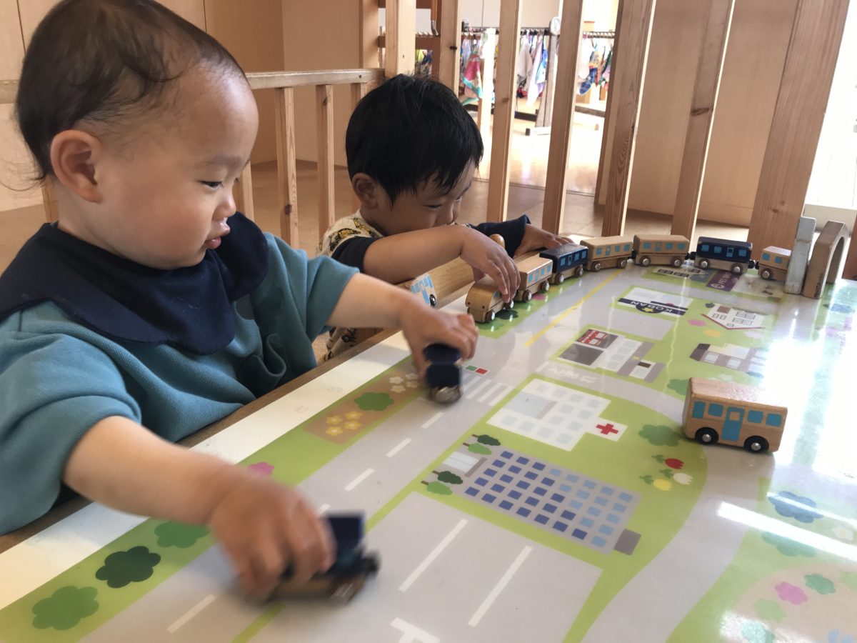 電車のおもちゃをながーく繋げていたお友だち。繋がった電車を机の上で「ガタンゴトン」と走らせ、トンネルの中をくぐらせてみたり、机を一周してみたりと楽しんでいると向かい側から同じように進んできた電車が…。でもお互いぶつかりそうになると、隣を走らせて上手にすれ違うことが出来ました。