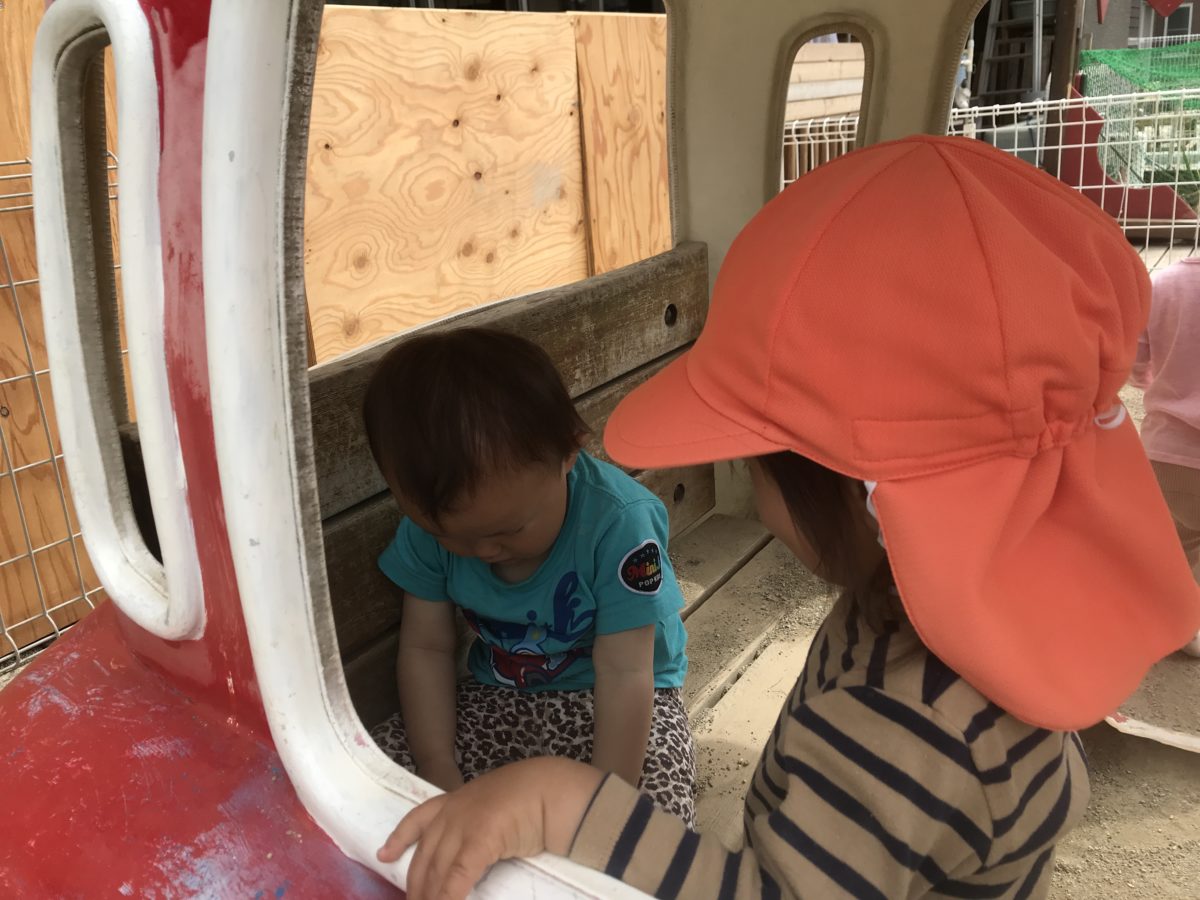 園庭では、いちご組のお友だちの靴が脱げていることに気が付くと靴を持っていき「はい!」と渡し、履けるまでそばで見てあげているりんご組さんの優しい姿がありました。