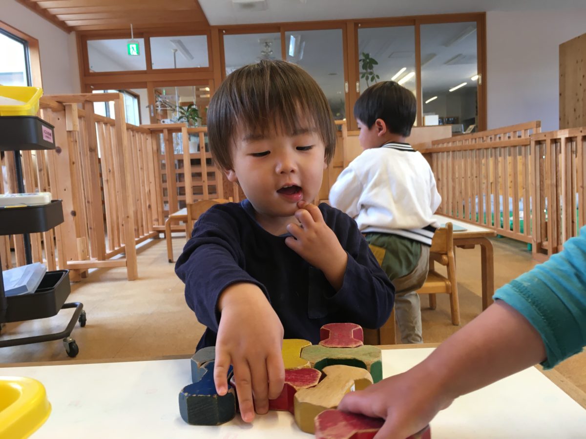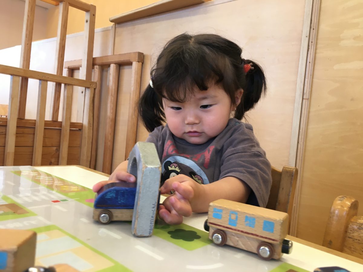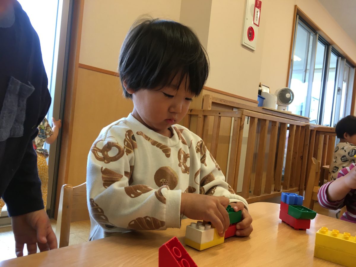 積み木やソフトブロック、好きなおもちゃを見つけると椅子に座り遊びに真剣な子どもたち。「ガタンゴトーン!」と井型ブロックを電車に見立てて遊ぶお友だちもいれば、積み木をパズルのように並べ遊ぶお友だちなどなど。子どもたち同士で遊びを工夫しながら楽しんでいます。中でも興味を示していたのが、穴が空いた棒のようなおもちゃ。複数空いた穴や出っ張りを組み合わせるのですが、偶然はさみのような形に!「みて!うごくの」と動きもはさみそのもの。「はさみみたいだね~」と閉じたり開いたりしていると、その姿を見ていた周りのお友だちも真似っこ。「はさみ!」とブロックのはさみを使い、身の回りの物を挟んでいます。「せんたくばさみみたい!」「はさむの」「ちょきちょき~」と色々な物を挟みながら楽しんでいました。