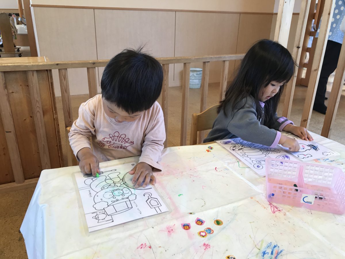 お部屋で塗り絵をしていたお友だちは、好きな色のクーピーを取り、枠からはみ出さないように塗っていました。「この色使う~!」「これにする!」とどの色にするかどれを塗るかをお友だちとお話をしながら選んでいました。隣の机ではホワイトボードに磁石をくっつけているいちご組さんの姿が。引っ付くのが楽しくて何度も繰り返し試していました。