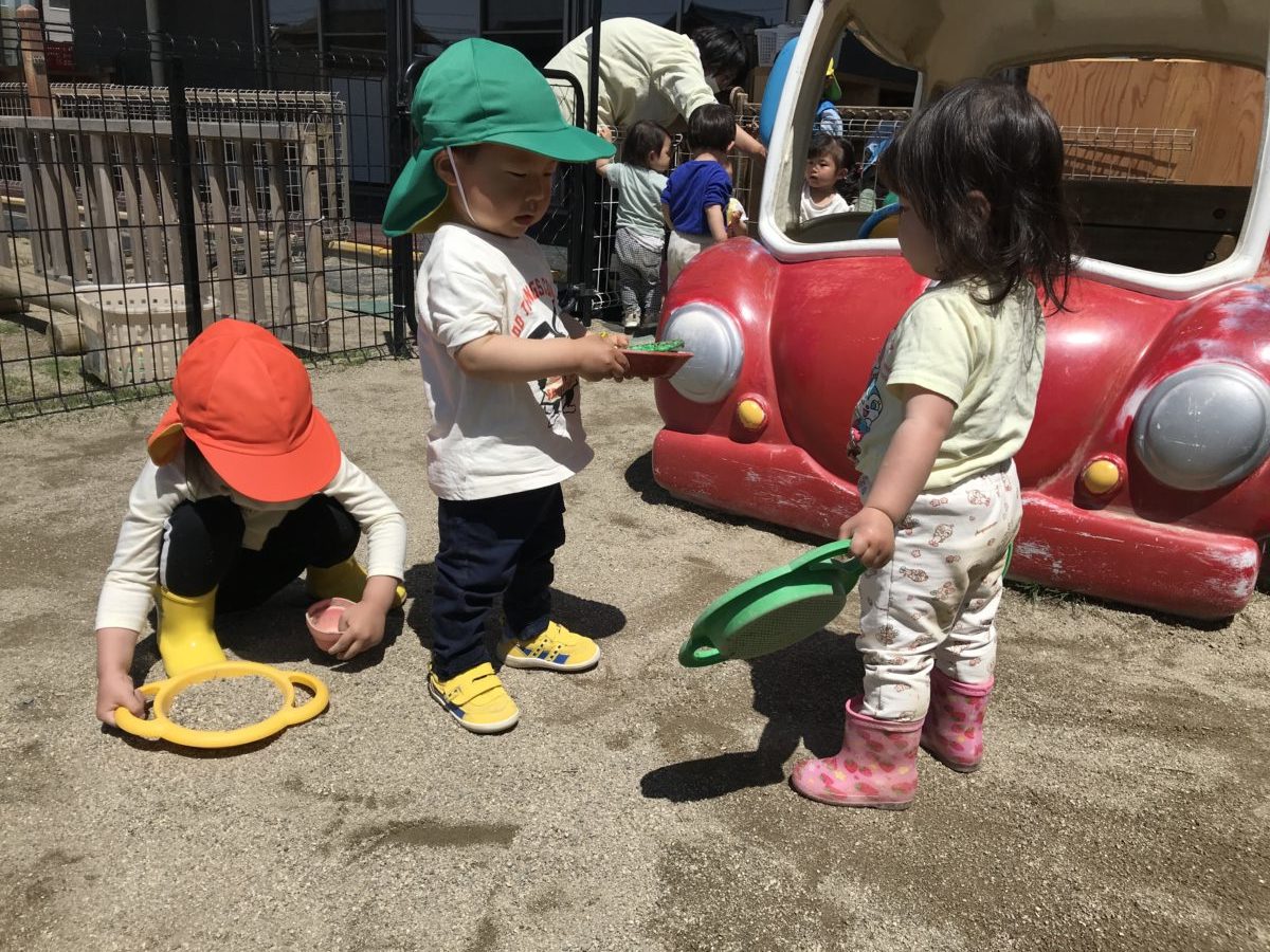 「見て見て~!」園庭で何かを見つけたお友だち。「これダンゴムシ~?」と、お友だちが捕まえた小さなダンゴムシにみんなで集まって観察をしていました。ダンゴムシが丸まると「まるになった~!」と様子を楽しんで見ていました。