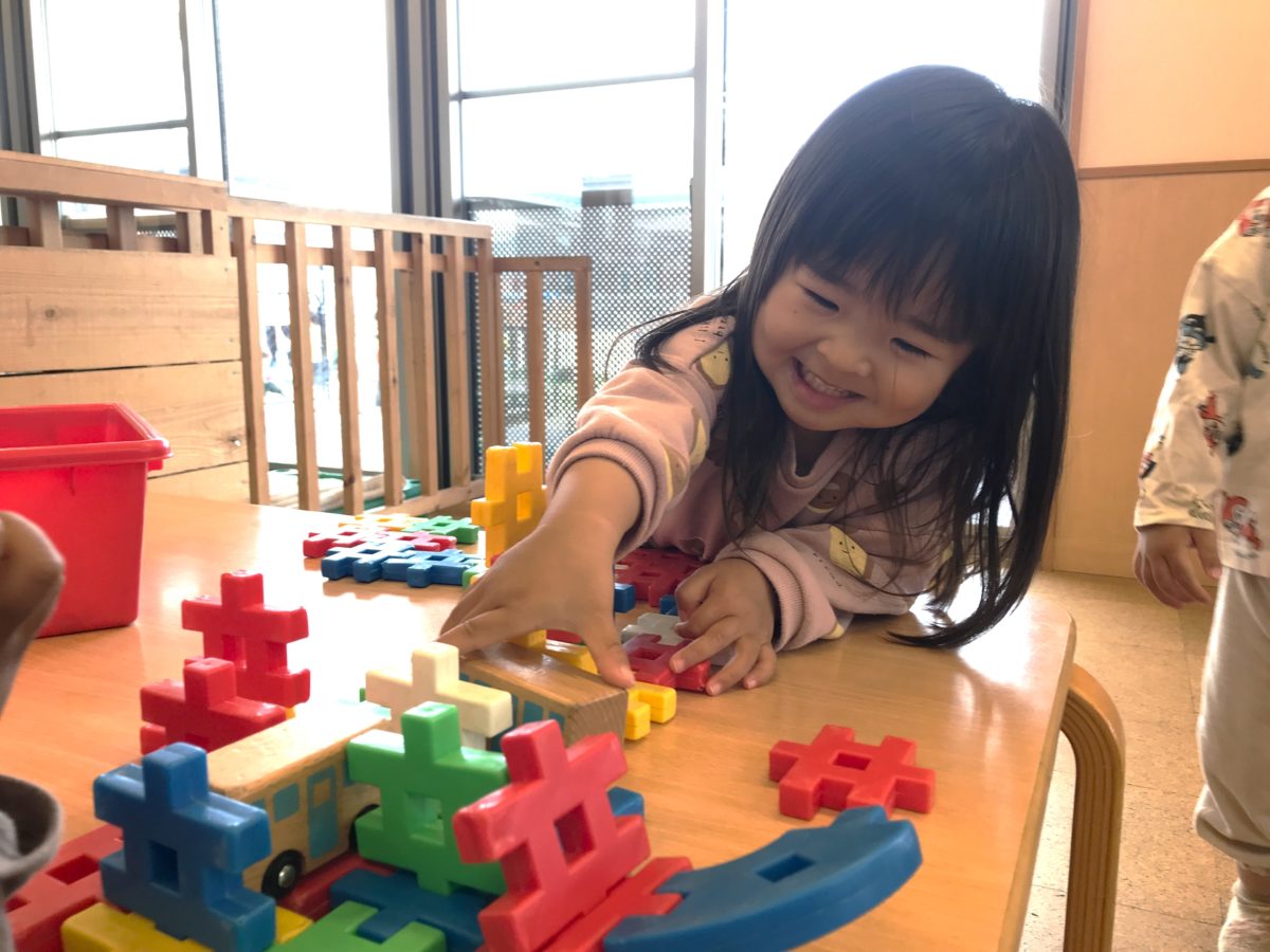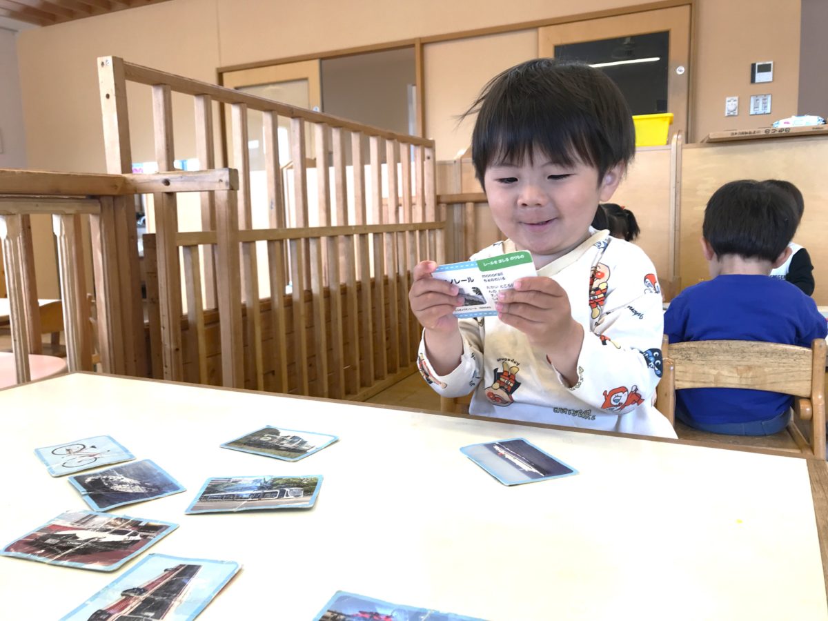 以前乗り物の大型絵本に興味を示していた子どもたち。今日は絵本以外にも、乗り物の写真が沢山載ったカードを準備してみようと保育士が持っていると「これみたい!」と早速その姿を見ていた子どもたち。「ちょうだい」「みるの」と乗り物のカードを机の上いっぱいに並べると「これみたことある!」「しってるよ!」と次々に楽しそうな声が聞こえてきます。「しょうぼうしゃすきなの」「これきゅうきゅうしゃ!」と大人気な働く車の中には、少し難しい乗り物もいっぱい。「あ!これこのまえのった!」と指を差しながら教えてくれたのはロープウェイ。「ぼくもこれのった!」とすっかり乗り物に夢中な様子です。更に、前回見ていた大型絵本も置いてみると乗り物への興味は更に広がります。「くるまいっぱい!」と絵本と睨めっこしながら真剣な眼差しです。「つぎこれみよ」とお友だちと一冊の絵本を囲みながら楽しそうに見る子どもたちでした。