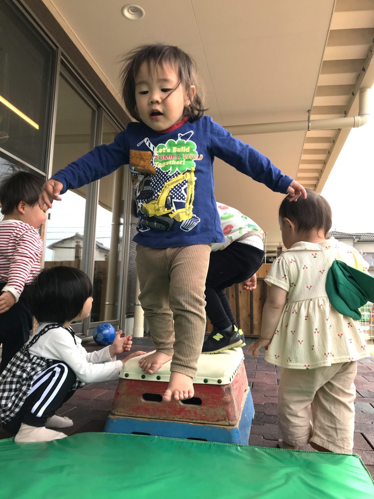 一方別の場所では、園庭を走ったり遊具に登ってみたりと元気いっぱいな子どもたち。小さな段差をジャンプしてみたりと体を動かす様子から、マットと跳び箱を準備してみる事にしました。すると跳び箱の上からジャンプ!その姿を見ていた周りのお友だちもジャンプ!「つぎやる!」「もっかい!」と何度も何度もジャンプをしながらとっても楽しそうでした。