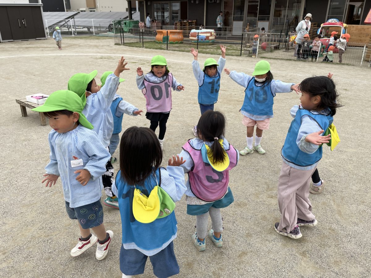 たまたま、お友だちの足にとまったてんとう虫。そのてんとう虫をそっと捕まえてケースへ…!!すると子どもたちはそのてんとう虫にくぎ付けで「みてーてんとうむしがけーすのよこをのぼっていってる!」このケースつるつるなのにどうしてのぼれるの?」「てんとうむしのあしはまほうのあしやな。」と子どもたちが話していました。園庭では「わたしたちもだんすしたい!」とめろん組さんがダンス教室を行っているのを見てダンスがやりたくなったばなな組さん。「みんなでまぁるくなろ!○○ちゃーん」とお友だちを誘ってみんなで丸くなってダンスを楽しみました♪「わたしたちもダンスきょうしつしたいなー。」と今からダンス教室へ参加することを楽しみにしているようでした。園庭にはハードルを出すと「これ、ぼくやりたーい」とさくらんぼ組さんたちが挑戦し始めました。以前はハードルを両足でジャンプしていた子どもたちでしたが、上手に片足でハードルを飛び越えようとする姿へと変化しかっこよく跳び越えていくようになってきました。