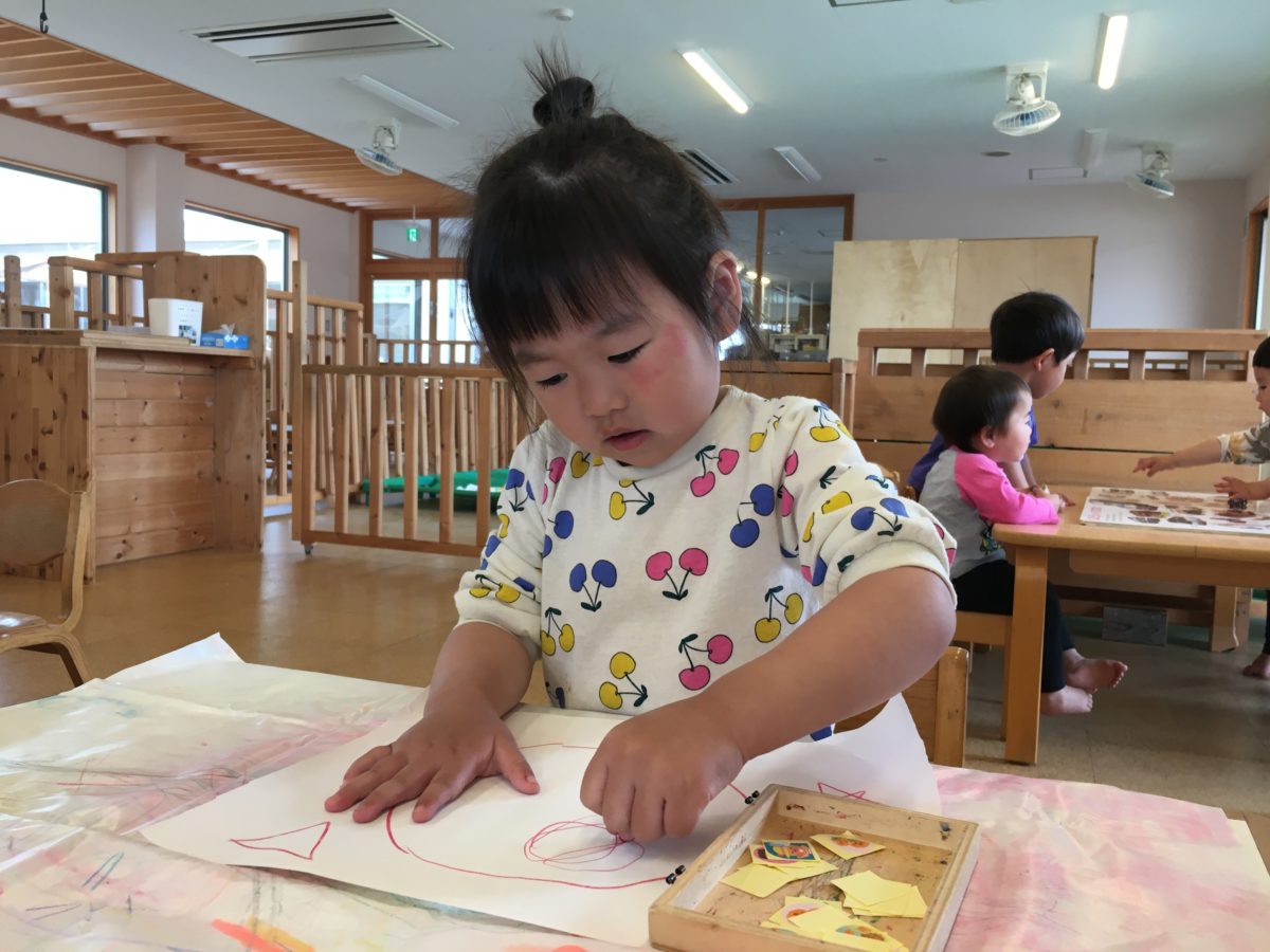 「これしょうぼうしゃ」「あ!きゅうきゅうしゃ」「これなに?」と何やら楽しそうな声が聞こえてきました。そっと覗いてみると、乗り物の大型絵本を囲み見ている様子。絵本の中には新幹線や車の車内、更には見たことのない働く車がいっぱいです!「くるまいっぱい!」と乗り物が大好きな子どもたちは目を輝かせながら絵本に見入っています。そんな姿から更に乗り物の写真カードや、消防車やパトカーの形をくり抜きラミネートした物を置いてみることにしました。すると早速気が付いたお友だち。「これみたい!」とカードを手に取ると「しょうぼうしゃいっぱいだね~」「ブーン!」と机の上で走らせてみたり、中には「ぶおーーん!」「とんでるの!」と空飛ぶ消防車に大変身させているお友だちの姿も。「ぼくもこれやりたい!」「どうぞ」とお友だちとやり取りしながらすっかり働く乗り物に夢中な子どもたちでした。