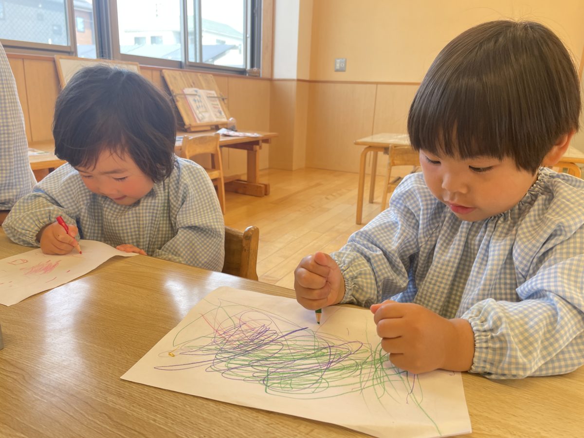色鉛筆を使ってお絵描きを楽しんでいました。すると「わたしさ3さいの3がかけるようになったの。あとは1もかけるよ!」とたくさんの数字を紙に書いたり「このいろすきなの~!」と自分の好きな色の色鉛筆でたくさんの丸を描いて楽しむ姿もありました。置いてあった野菜や果物の資料を見て「あーこれぼくのすきなきういふるーつ!!ちょっとすっぱいんだけど、おいしいんだよね。あとバナナものってるね。きょうのきゅうしょくででるよね。」と大好きな果物の話で盛り上がっていました。また、細い白い紙を丸めたくさん繋げていき「こんなにつながったの~!」とたくさんの輪飾りが出来ていました。作っている時には「のりたくさんつけるとさ、くっつけたときにでてくるから、すくなめのがよさそう。」と付ける糊の量にも工夫している子どもたちでした。ビブスを片付けるときには「きれいにかたづけたほうがあしたきやすいね。じゅんばんにたたむようにしたいな。」と話し、きれいに1枚ずつ数字に注目しながら片づけていました。すると「ぼくもてつだうね。」とほかのめろん組さんや、ばなな組さんとみんなで協力しながらきれいに片づけていました。
