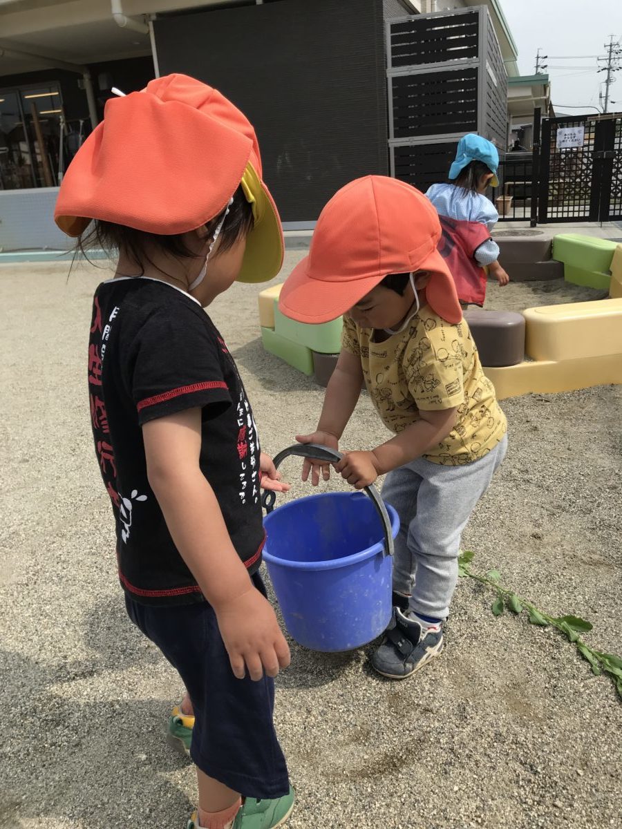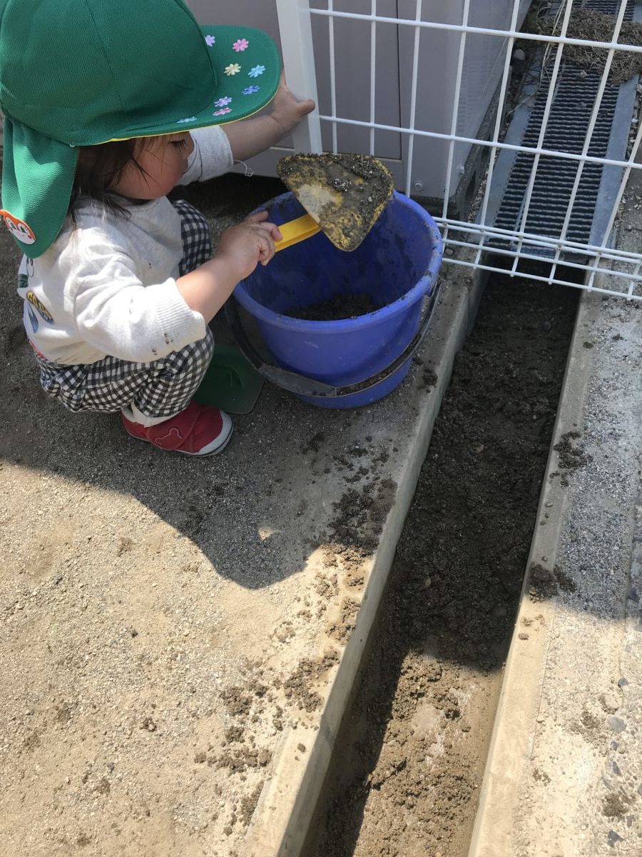 園庭をお散歩をしていると溝に砂がいっぱい溜まっていたので、スコップを手に溝掃除をしました。子供たちにとっては砂遊びの1つでしょうか、楽しんでやっていました。