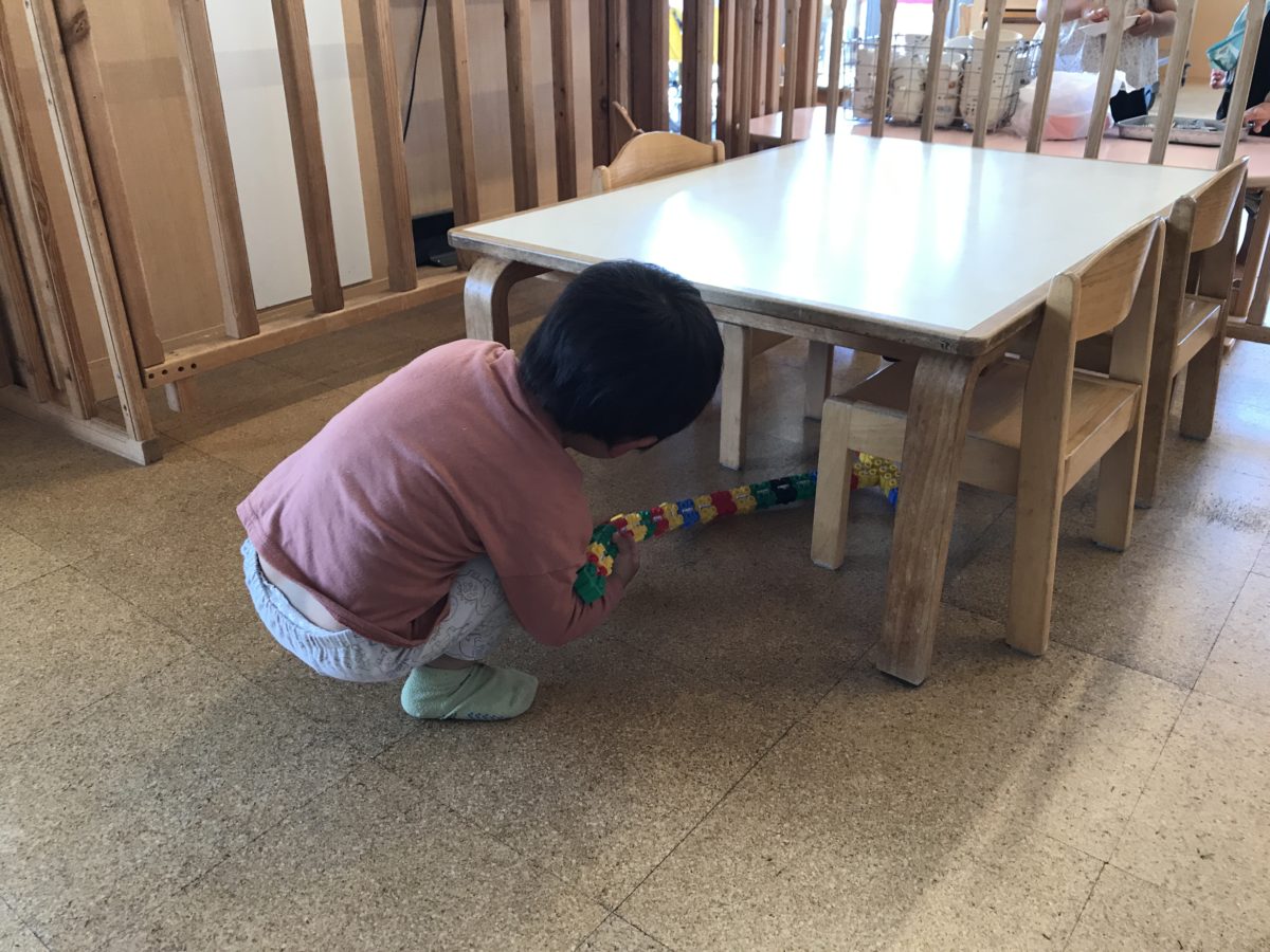 園庭をお散歩をしていると石がたくさん落ちていました。普段から石が大好きな子ども達ですが、みんなで石拾いをしよう!ということになり、バケツを持って来ると「バケツもつ!」と手に下げながら石拾いをしてくれました。小さいのや大きいの、丸いのや角があるもの、色々な形に気付きながらのお手伝いでした。お部屋では、リトミックの準備で名前シールをを貼っていると、「なに?」「なにするの?」とワクワクした表情。前回から少し日にちがたっているので忘れてしまっているようです。リトミックの先生から名前を呼ばれると、恥ずかしそうに俯いてしまうお友だちや「は~い」と元気に返事のできるお友達もいました。ピアノの低い音はぞうさんの歩く音。どっしどっしとぞうさんをイメージして歩きました。軽快な曲に合わせて歩いたり手足を動かしながらリズム遊びを楽しみました。