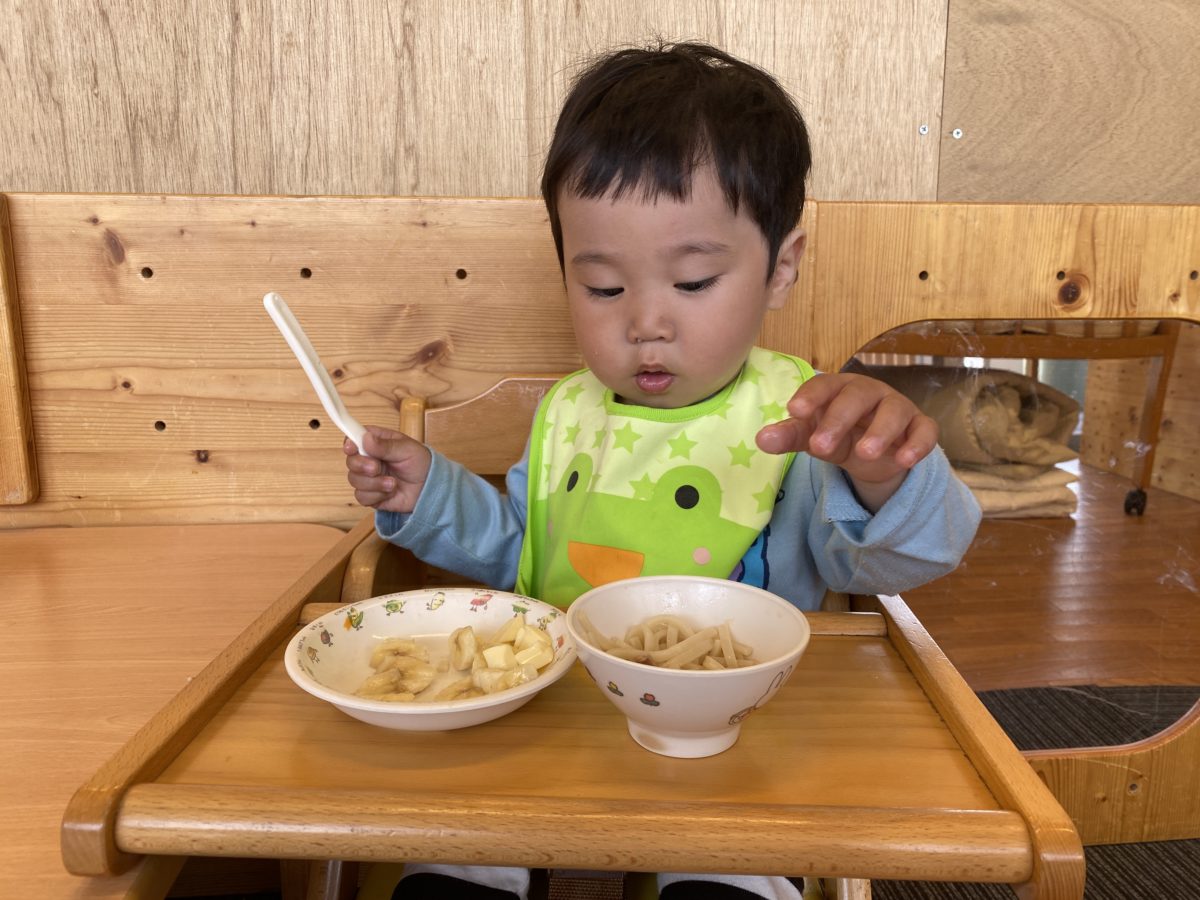 すいか組のお友だちの給食を食べる様子です。どれたべようかな~