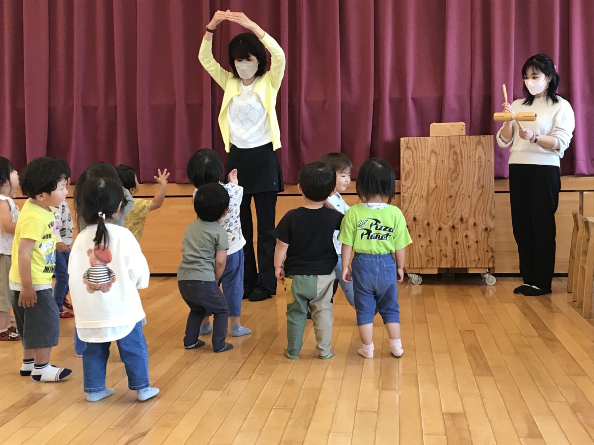 リトミックに参加しました。ピアノやウッドブロックのリズムに合わせて体を動かしました。