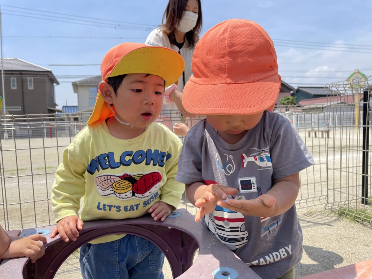 そして最後に見つけたのはバッタさん。最初はバッタを近づけると「うわぁ!」と大声をあげて逃げていた子もしばらくすると手にのせて観察する姿がありました。すると以上児のお友だちが「バッタの足は二本やで」とつぶやく声が聞こえてくると、どれどれ?と言わんばかりの表情でバッタの足に注目する姿が…しかし観察した結果「あし一本しかない…」と。見つけたバッタは足が一本しかなく不思議そうな表情を浮かべていました。きっとどこかでとれてしまったんでしょうね。
