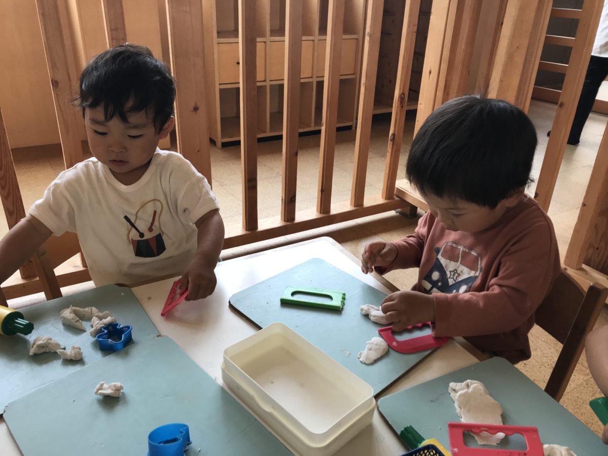 お部屋では先日から夢中になっている粘土遊び。粘土板を準備していると「これやりたいの」と興味津々な様子です。手のひらで転がしてみたり、細長くしてみたり。小さくちぎってみたりと粘土遊びに真剣な子どもたちでした。