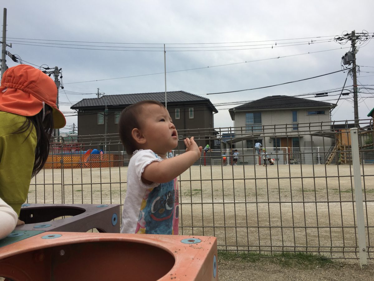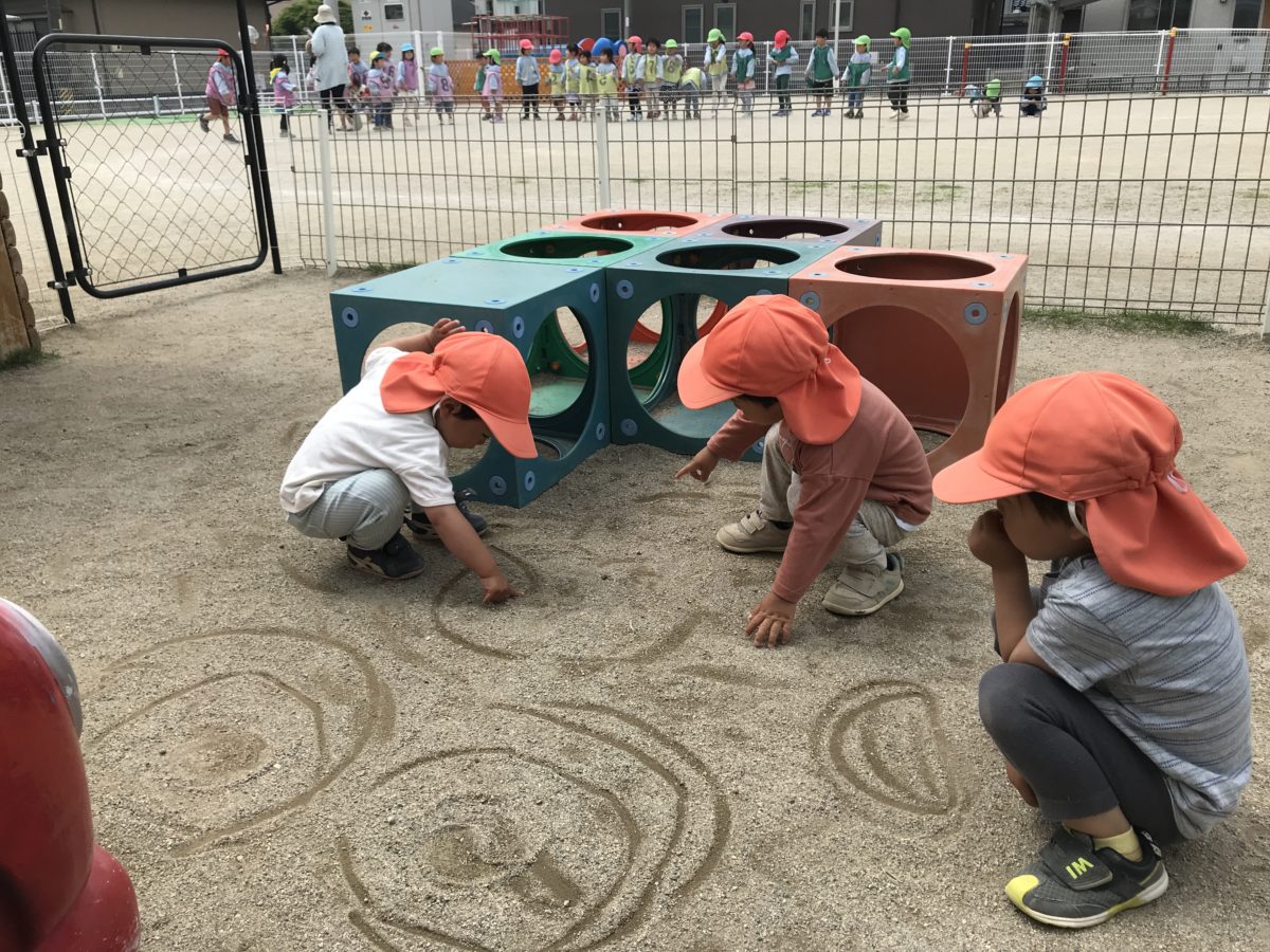 一方別の場所では、園庭を勢いよく走るりんご組のお友だち。大きいお友だちが走っている姿を真似て、園庭のトラックを何度も何度も走って楽しんでいました。走り終えた後は棒にぶら下がってみたり、ボールを勢いよく蹴り楽しむお友だちなどなど。大きいお友だちの姿を見て様々な事に挑戦していました。