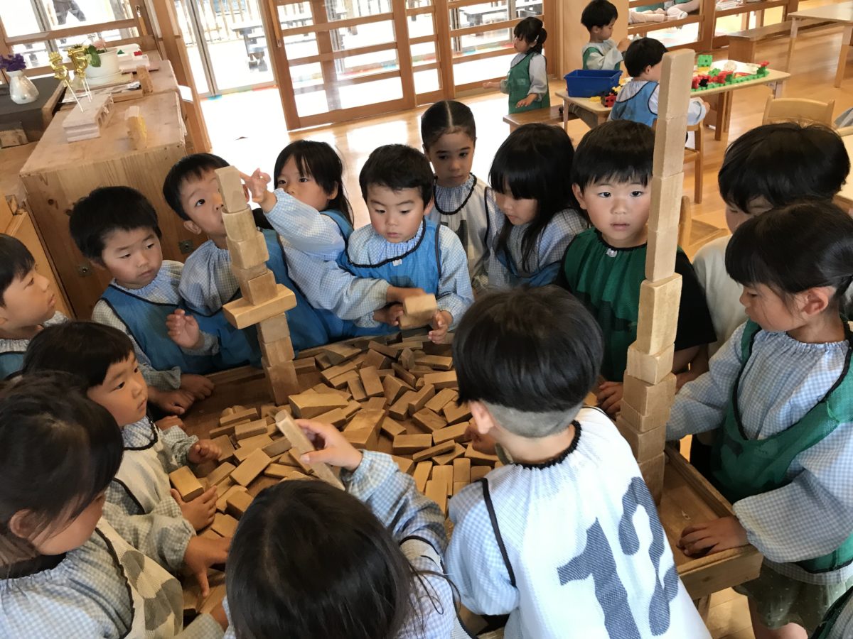 どのチームが一番高く積めるかな? リーダーさん中心に「おおきいのちょうだい!」「ながいやつ!」と工夫しながら積んでいる様子。
