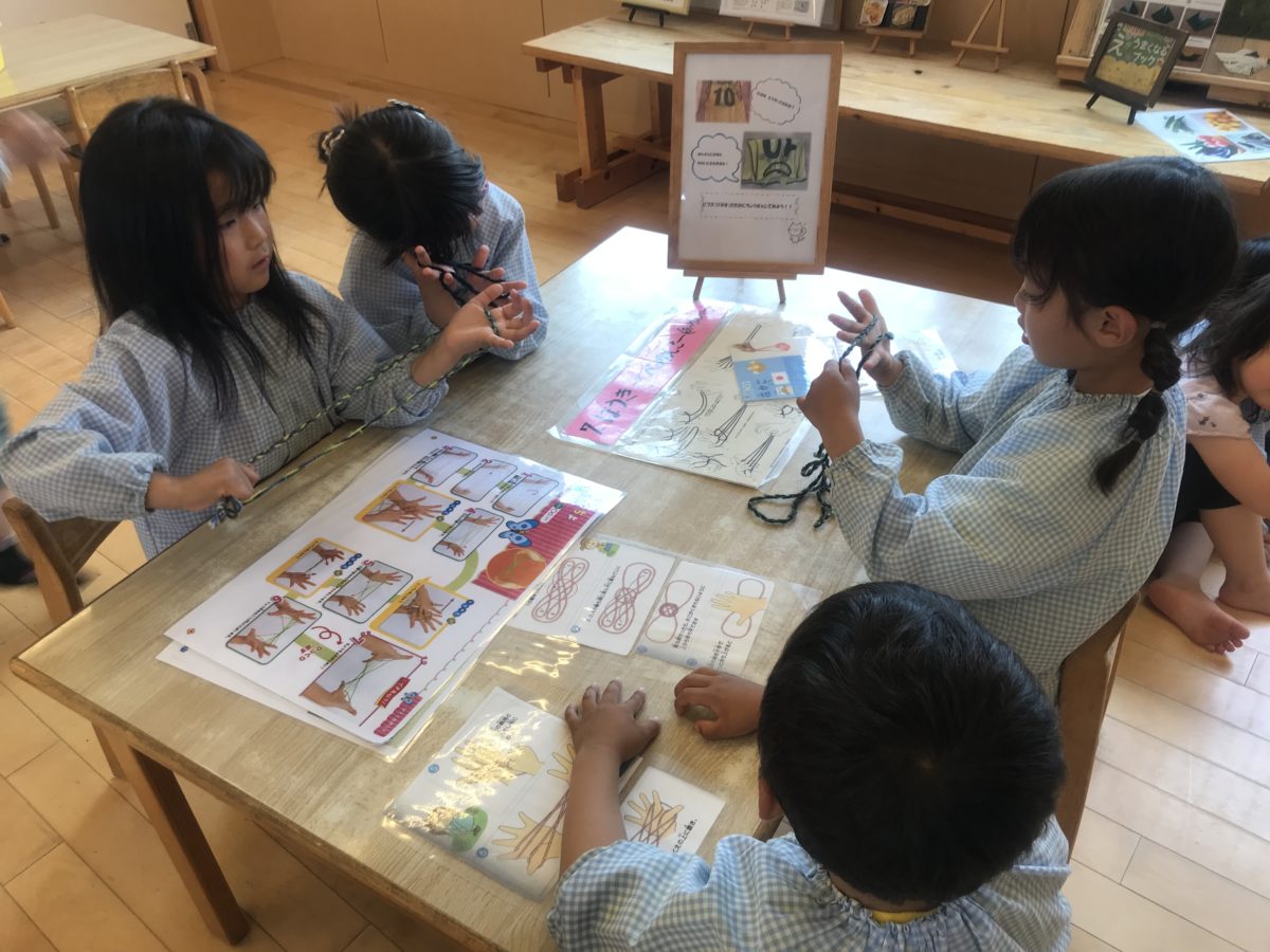 昨日からあやとりに夢中の子どもたち。 「やまつくれるようになった!」「どうやってやるん?」と教え合いながら真剣な表情で取り組んでいました。