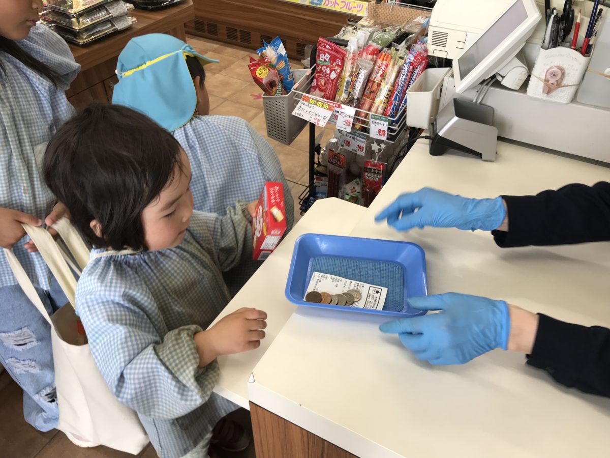 5月のお誕生児のお友だちはビスコの買い出しへ! ドキドキしながらお金を出す姿がありました。