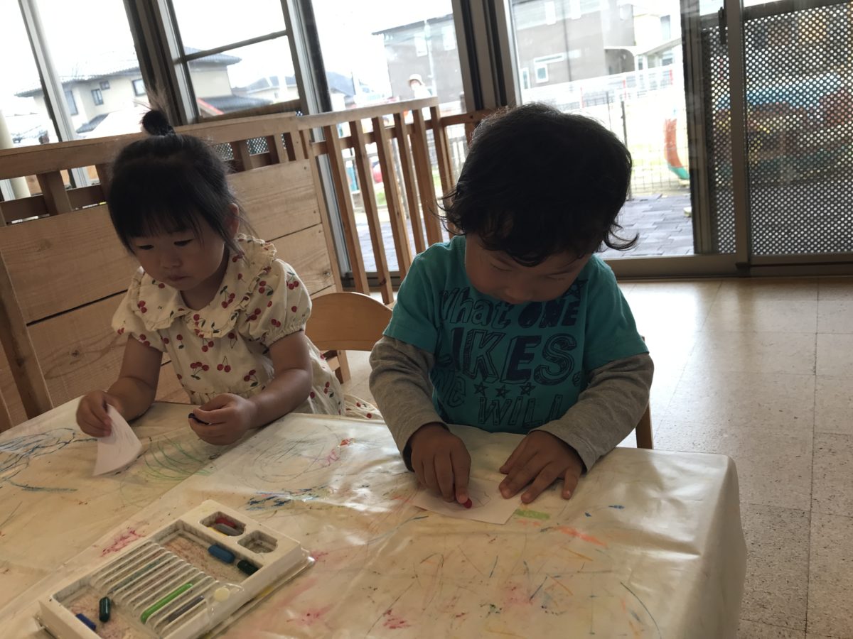 お部屋では、粘土を丸めて並べているお友だちの姿がありました。「これかいだん!」と並べた丸を繋げて階段にしていたり、「これパン!」と粘土を細長く伸ばしてパンを作っていました。隣の机では、クーピーでお絵描きをしている姿が。「ママにあげる~」と紙にぐるぐるとカラフルな丸を描いたり、線を描いて素敵な絵が完成していました。積み木で遊んでいたお友だちは、積み木の色を見て、「ぼくきいろ~」「みどり~!」と自分の好きな色を持って積み上げタワーにすると「できたー!」とみんなで喜んでいました。