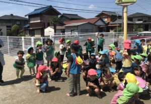 いつもは3チームづつリレーの勝負をしていますが、今日は6チームでリレー勝負をすることに!めろん組さんも少しずつ慣れてきたのか「つぎは〇ばんやで!」「はしったらならばせよ!」とチームで協力する姿があります。また今日は裸足で走り「なんかつめたいー!」「ぬるぬるするー」と土の感触を楽しみながら全速力で走っていました。