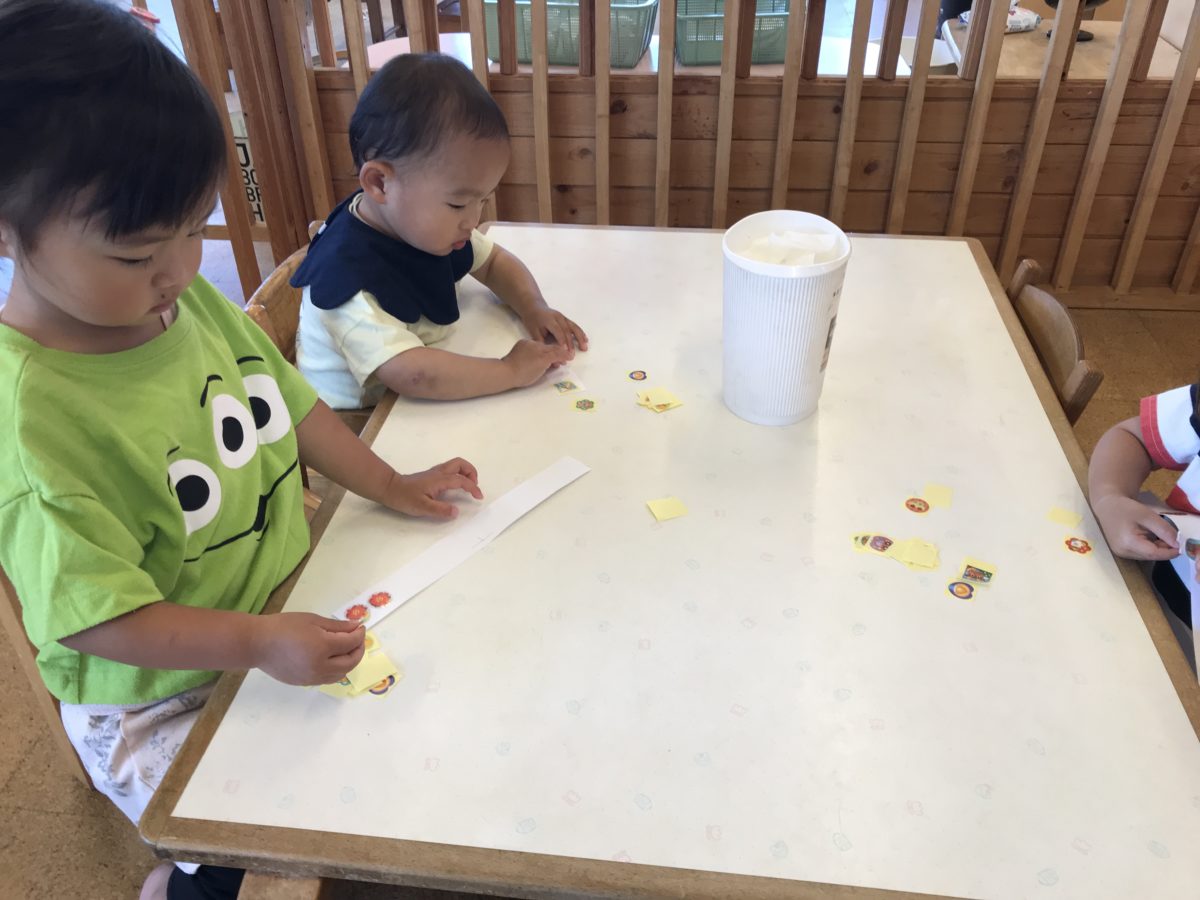 シール遊びでブレスレットを作って楽しみました。一生懸命シールを台紙からはがしてシール遊びを楽しむ様子が見られました。
