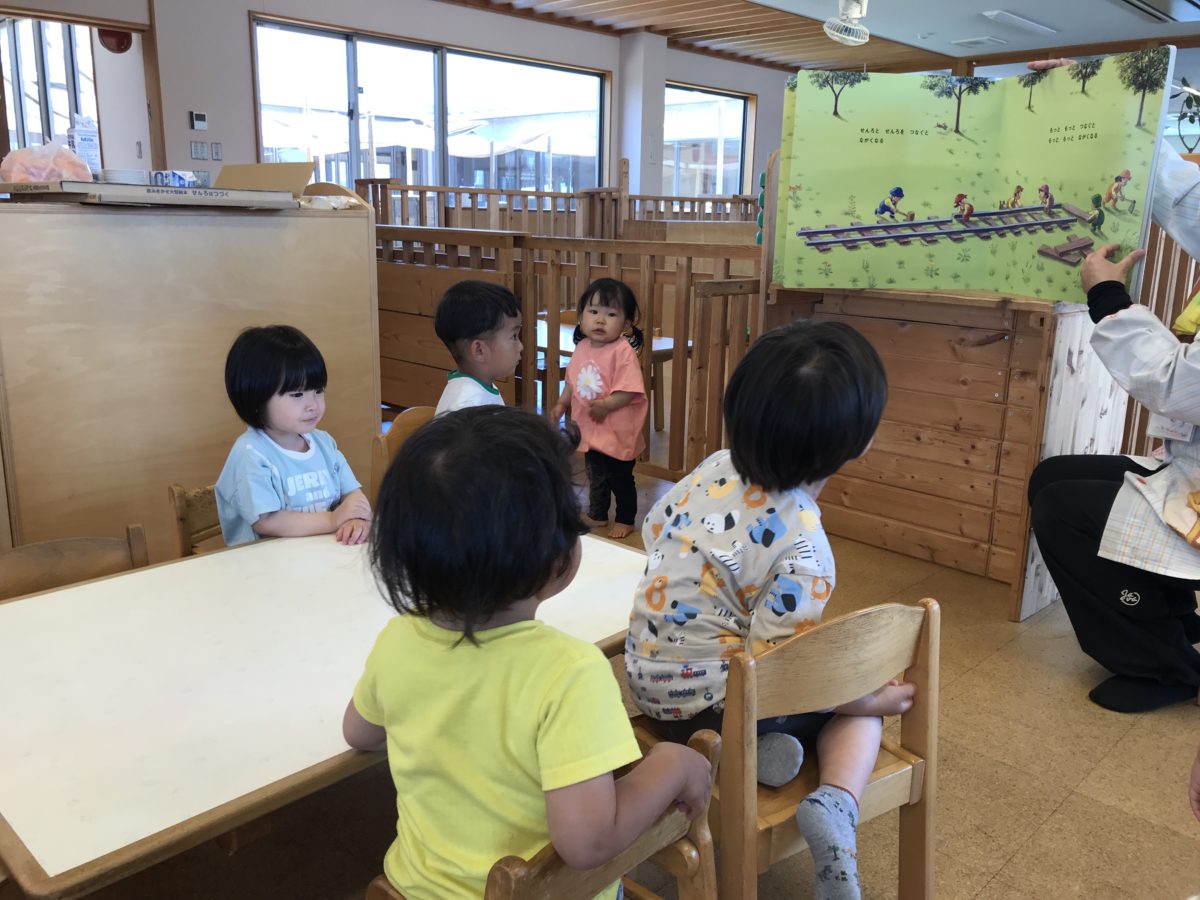 大きな絵本を見ました。お話を楽しみながら、絵本に出てくる動物を探したりお話を楽しんでいました。