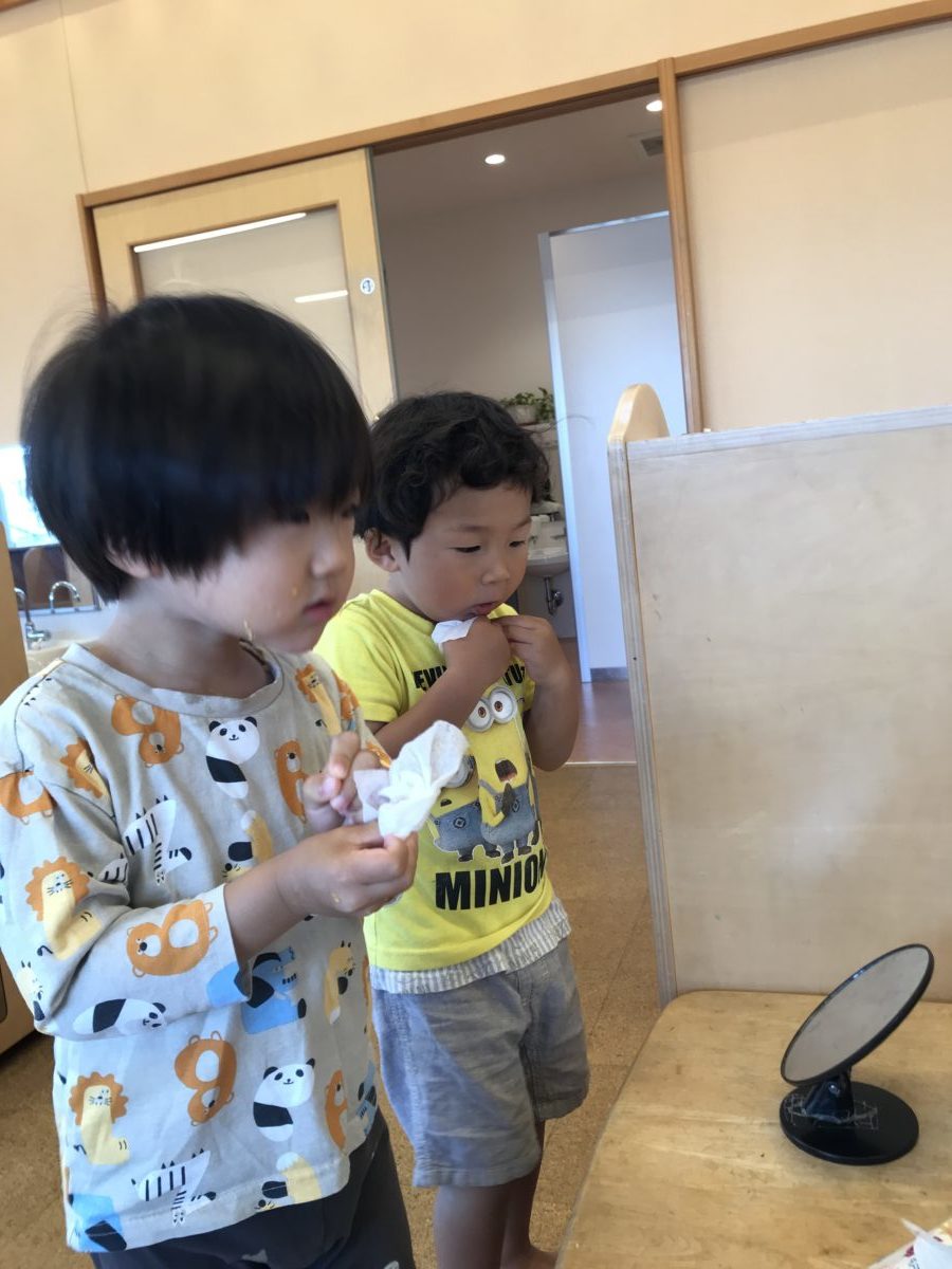 お口綺麗になったかな?鏡を見ながらお顔をチェックしています