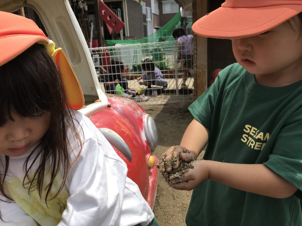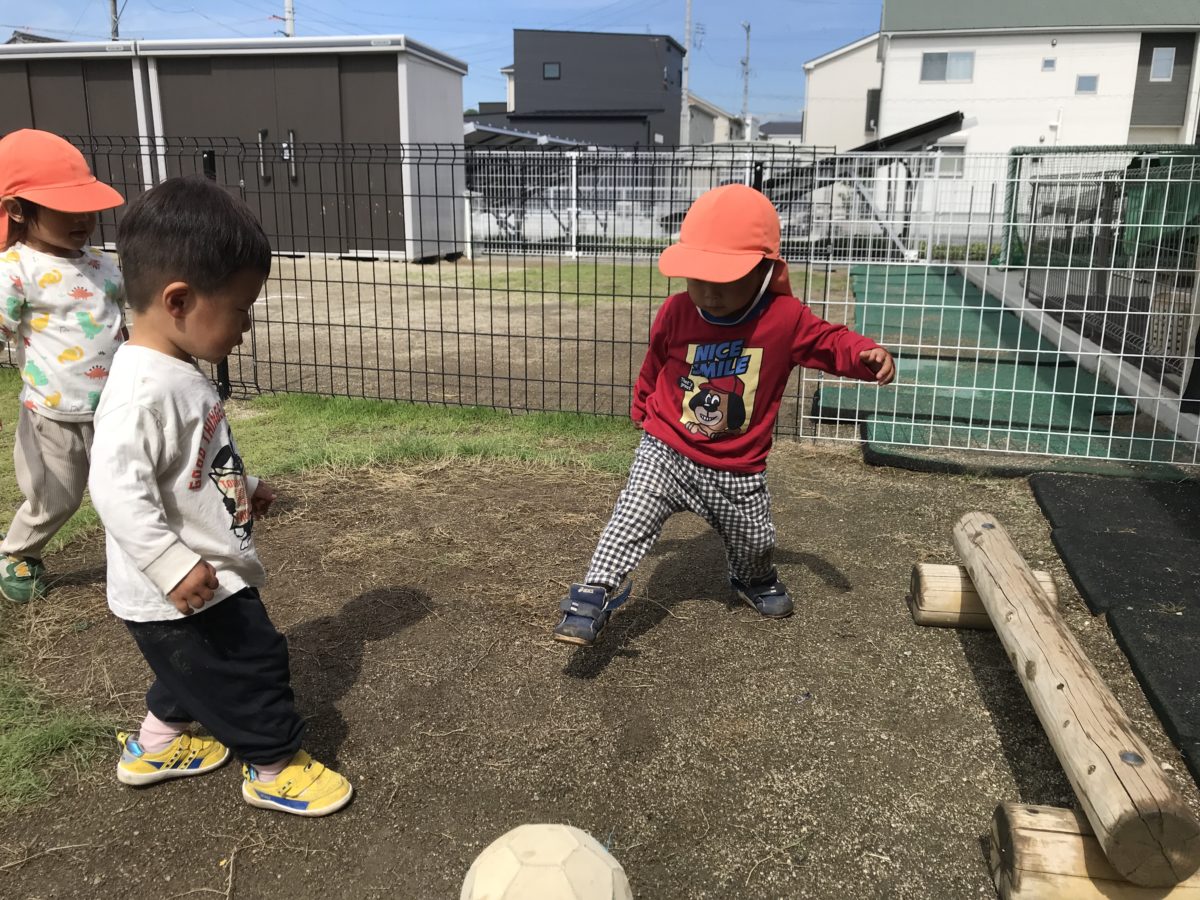 園庭では、泥団子づくりをしているお友だちが。「みてみて~まる!」と手のひらを上手に使って綺麗な丸が作れると、お友だちに見せたり、お兄さんお姉さんたちに「みて~!」と綺麗に作れたことを喜んで共有していました。ボールで遊んでいたお友だちは、ボールを置くと「いくよ?」とお友だちに向かってボールをキック!おともだちの方に転がると嬉しそうに、「こっち!」とボールを蹴り合っていました。