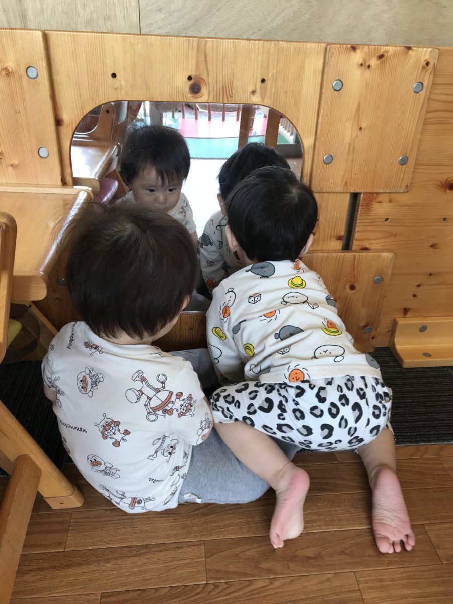 すいか組さんのお部屋では、鏡に映る自分の姿をじっと見つめている姿が。自分と同じ動きをするのが面白かったのか、鏡の自分に手を振っていました。